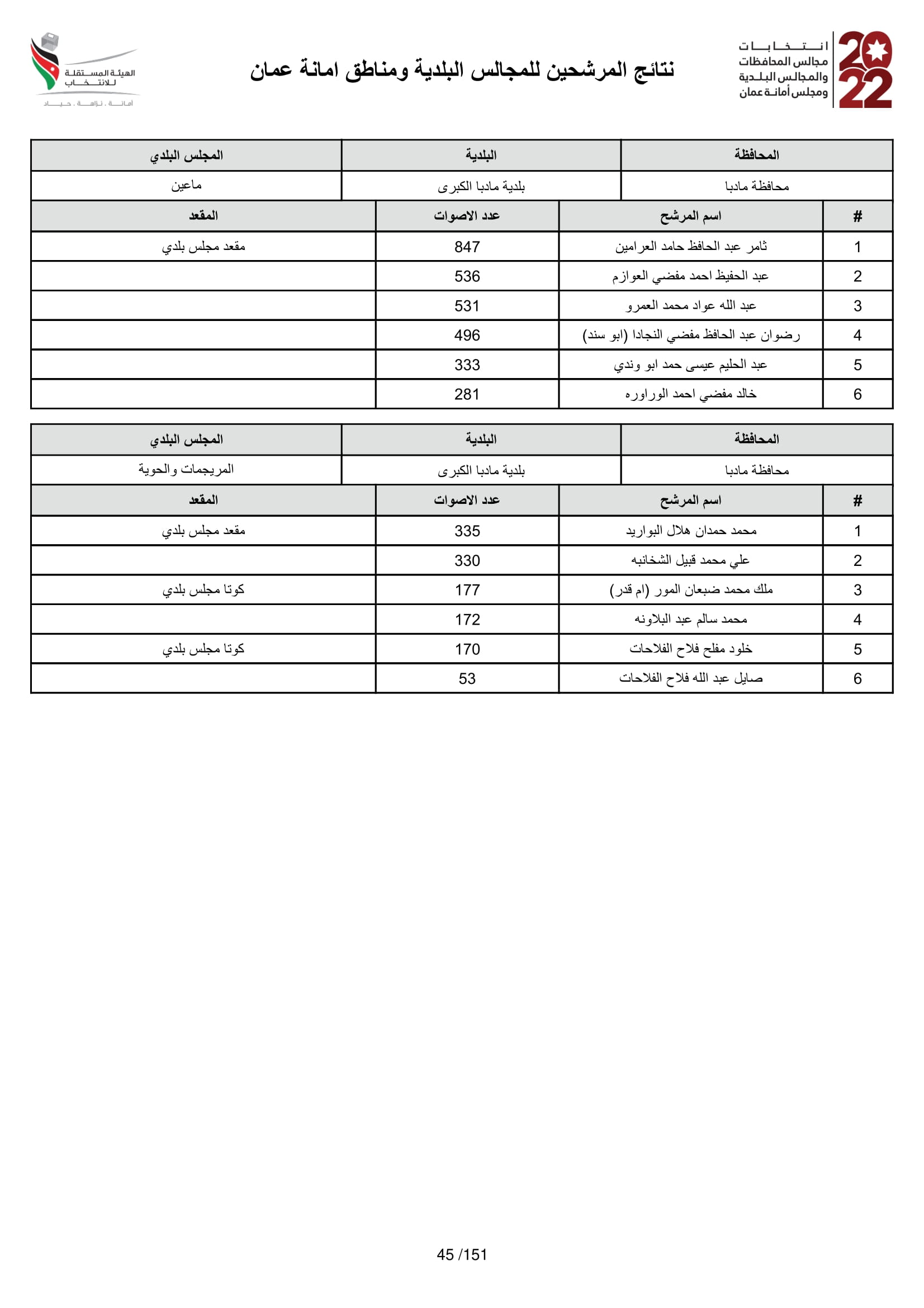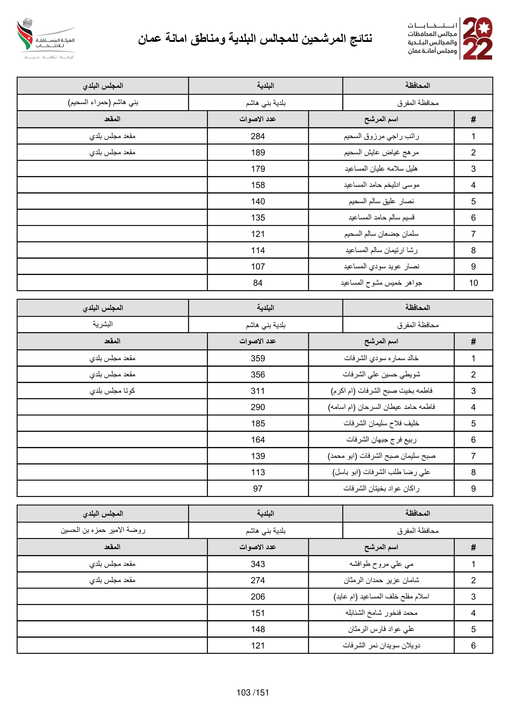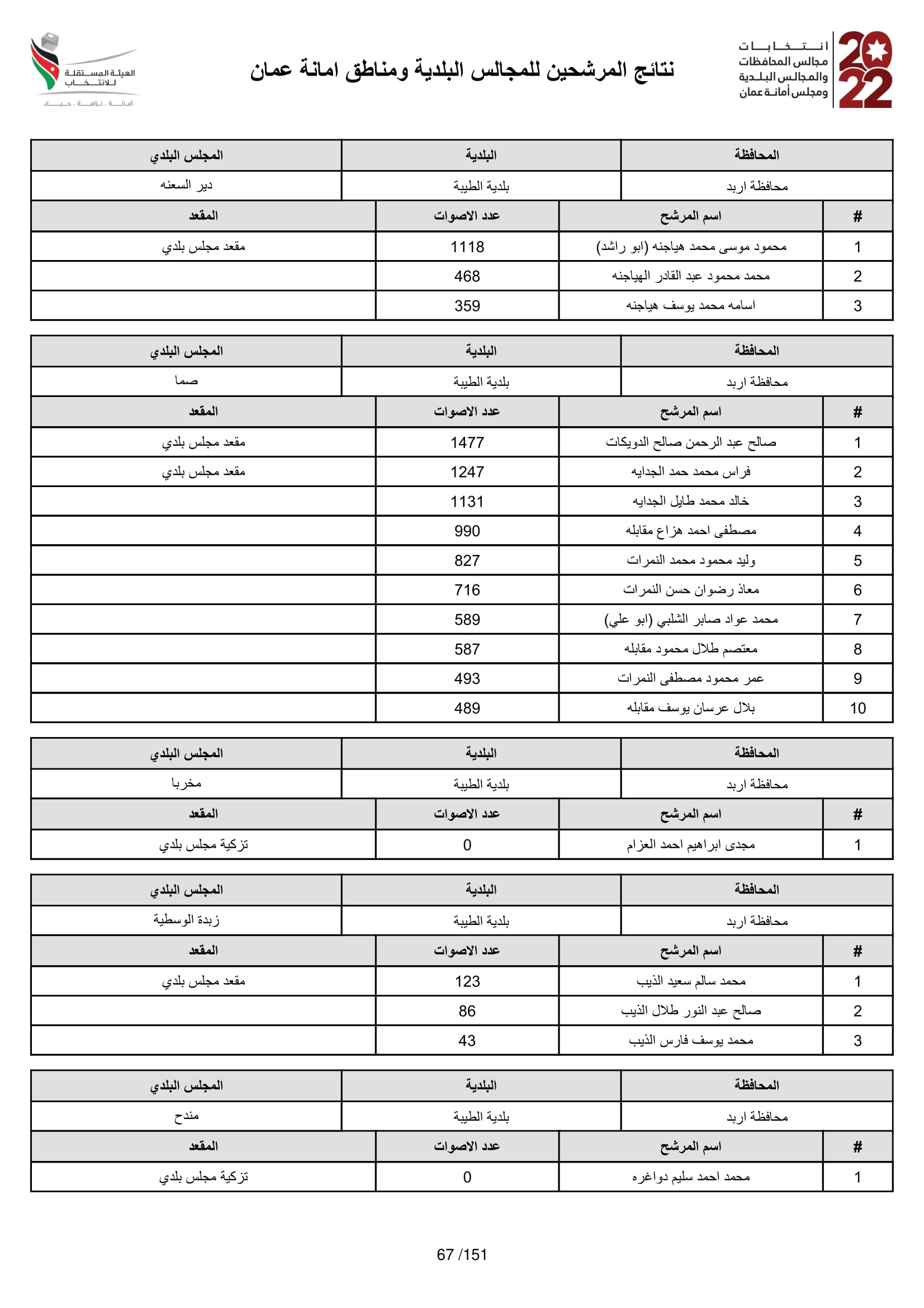 النتائج النهائية لإنتخابات مجالس والبلديات وأمانة عمان .. اسماء