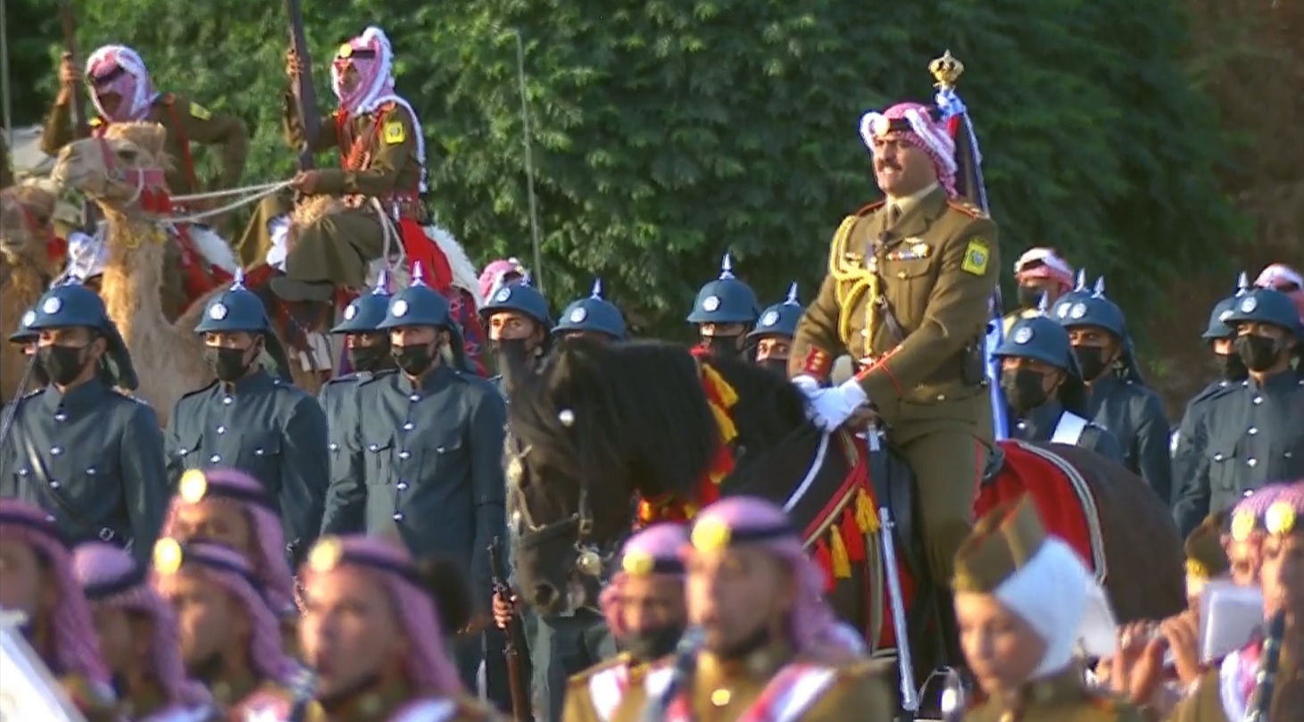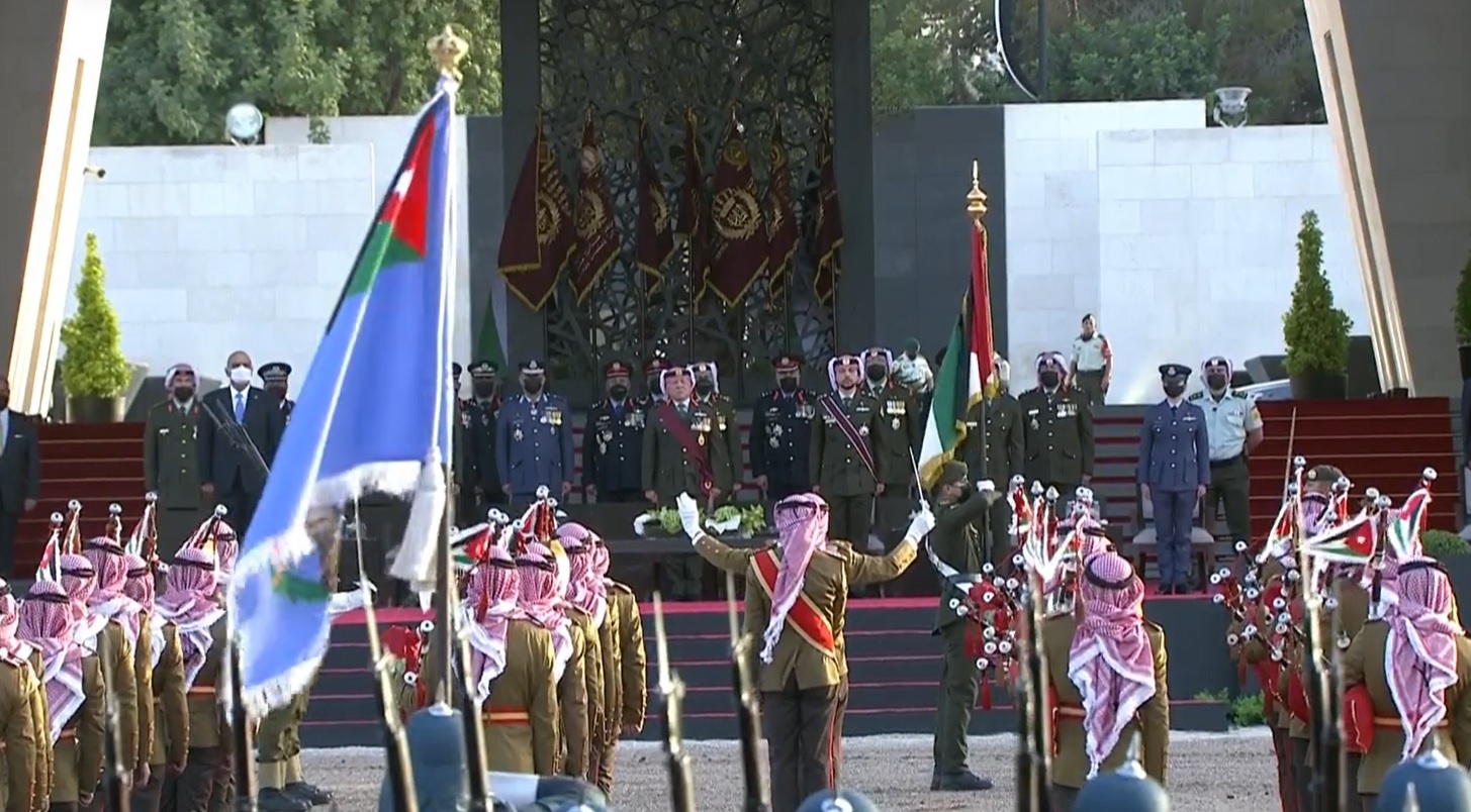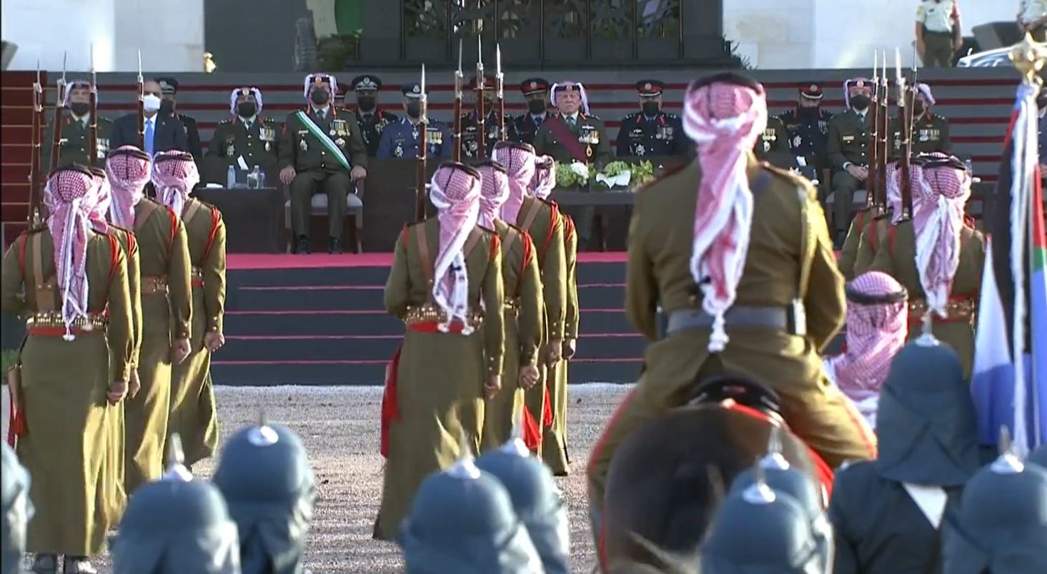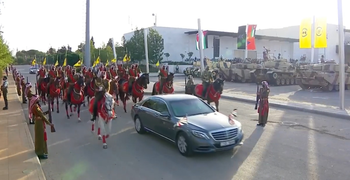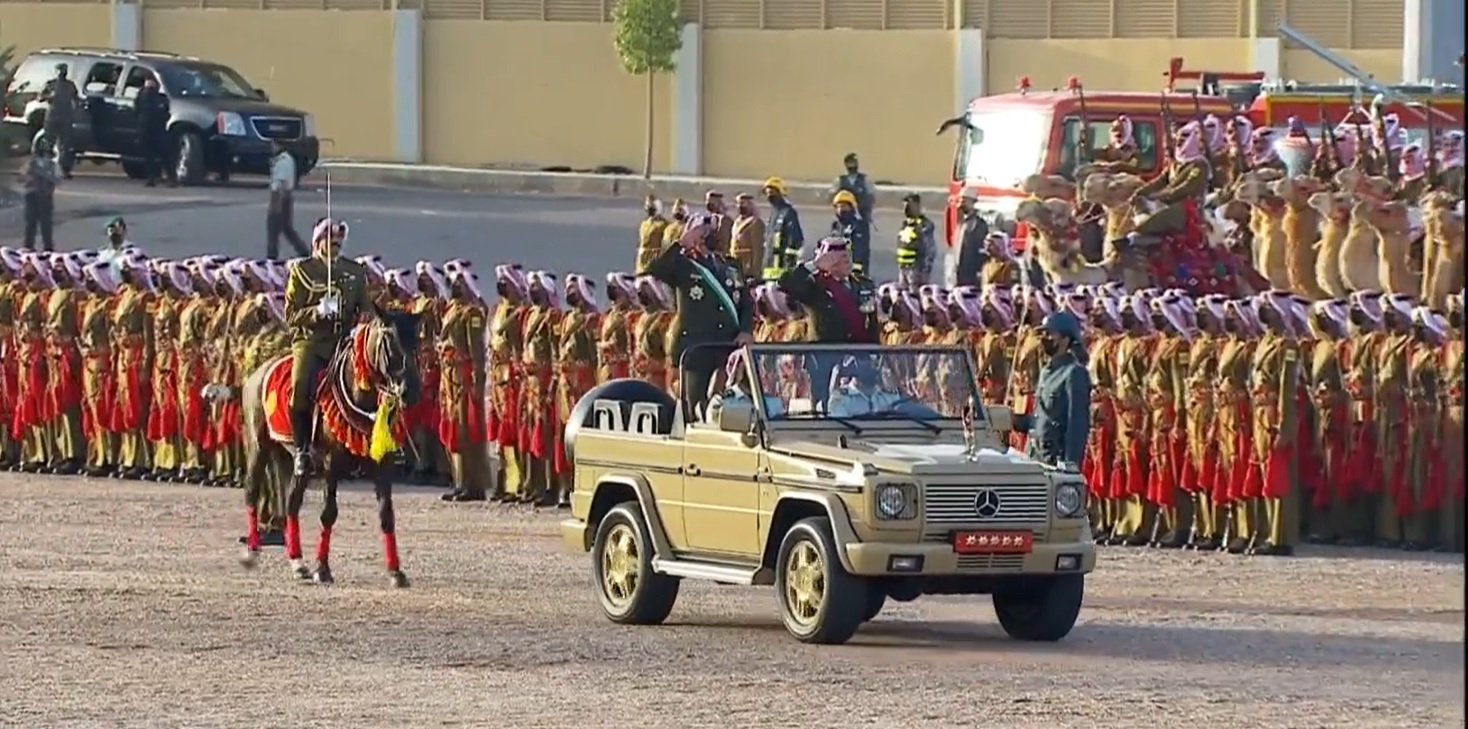 ولدى وصول جلالته الى الموقع اطلقت المدفعية 21 طلقة ترحيبا بجلالة الملك، فيما احاط به كوكبة من فرسان القوات المسلحة.
