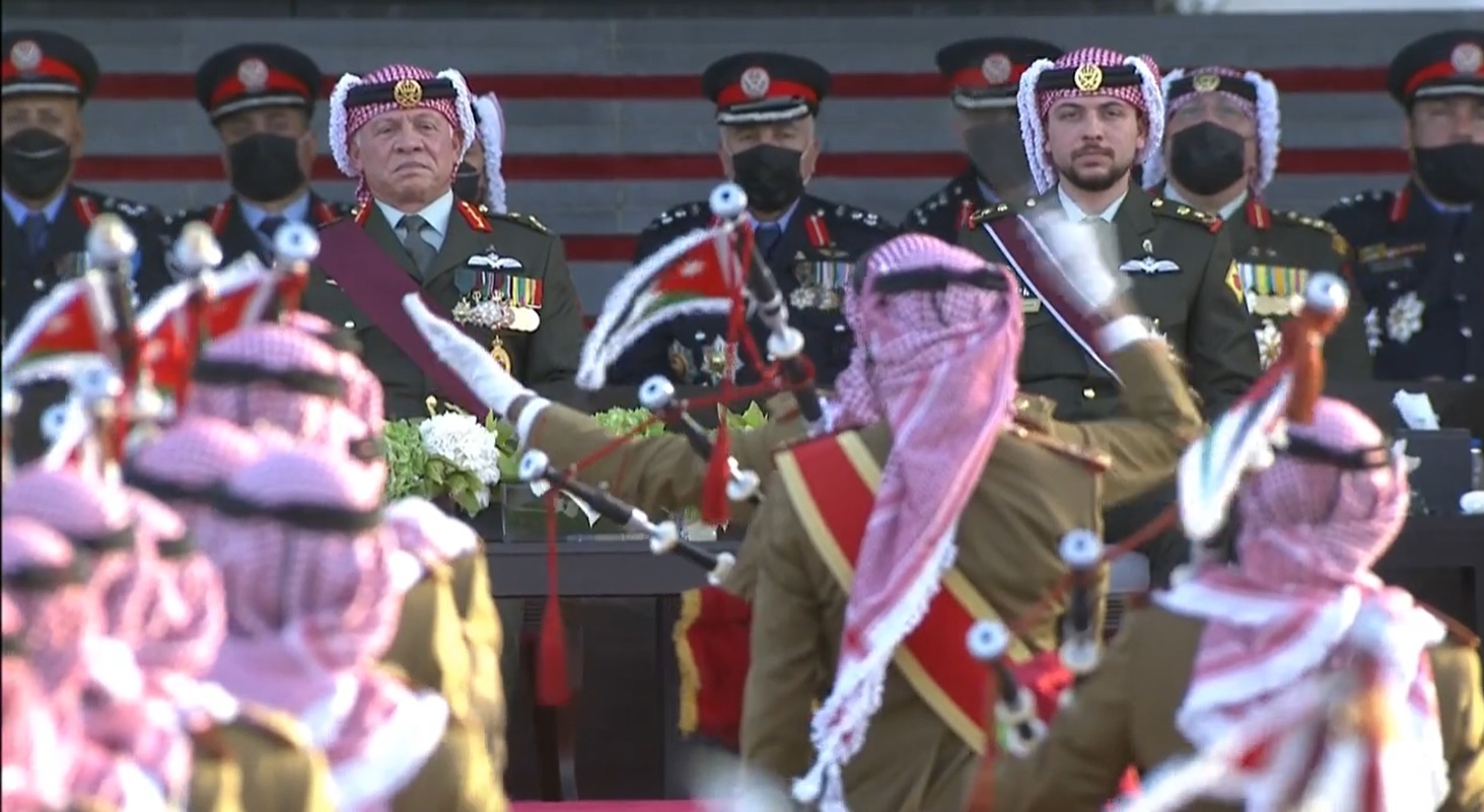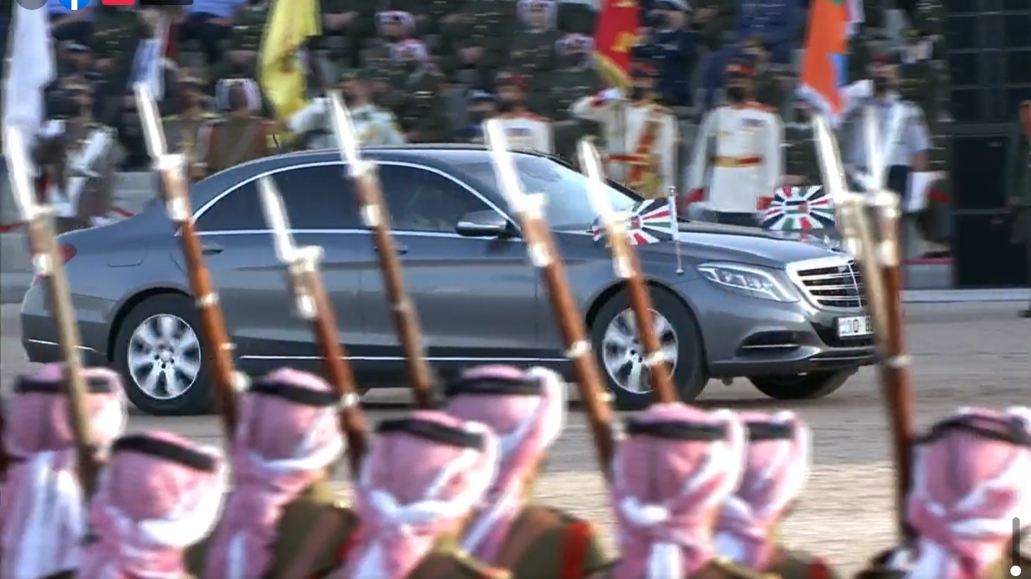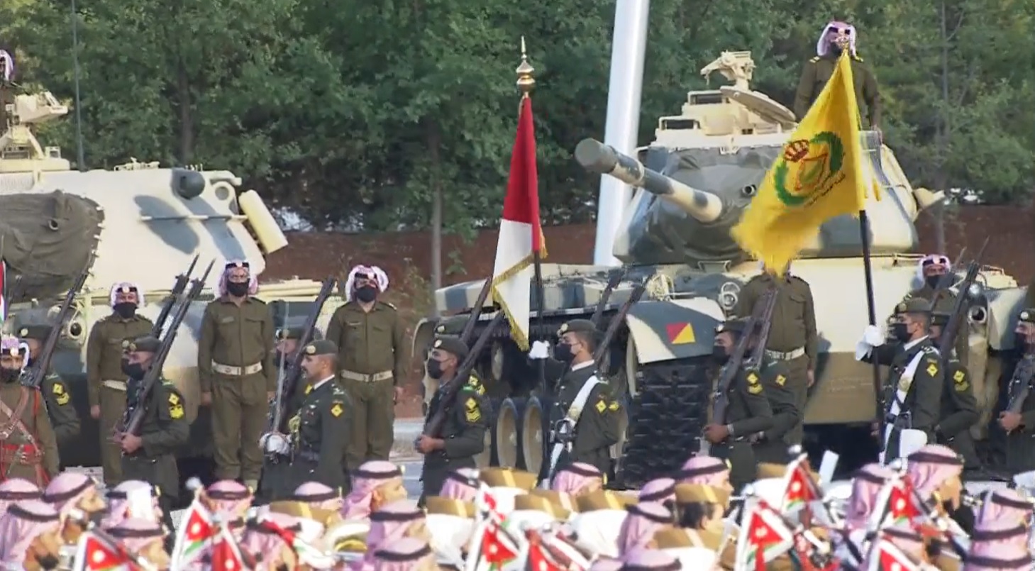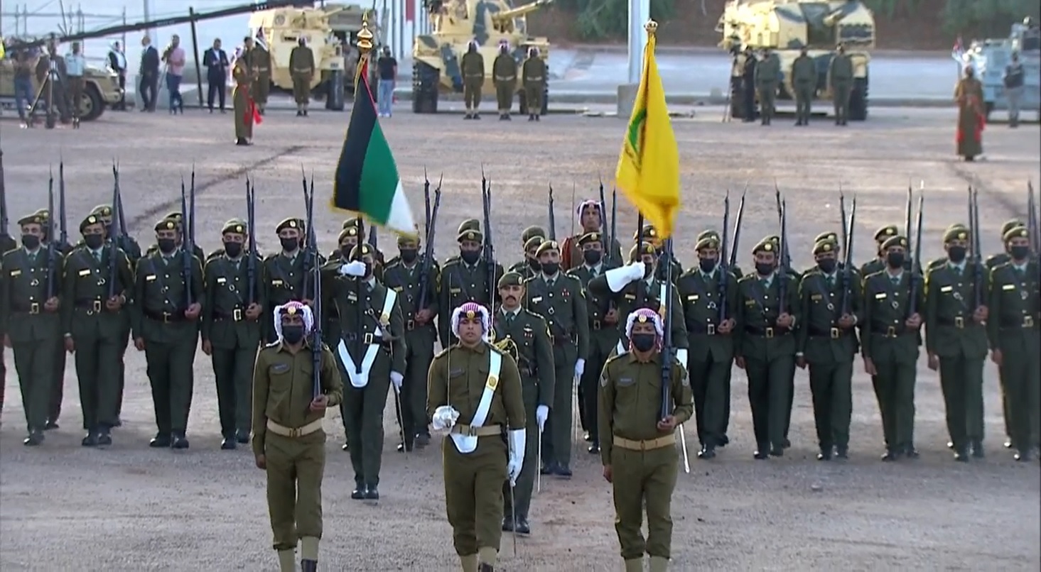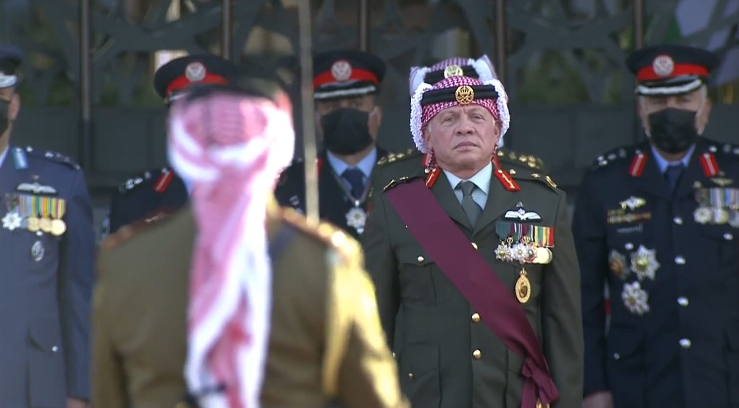 ولدى وصول جلالته الى الموقع اطلقت المدفعية 21 طلقة ترحيبا بجلالة الملك، فيما احاط به كوكبة من فرسان القوات المسلحة.