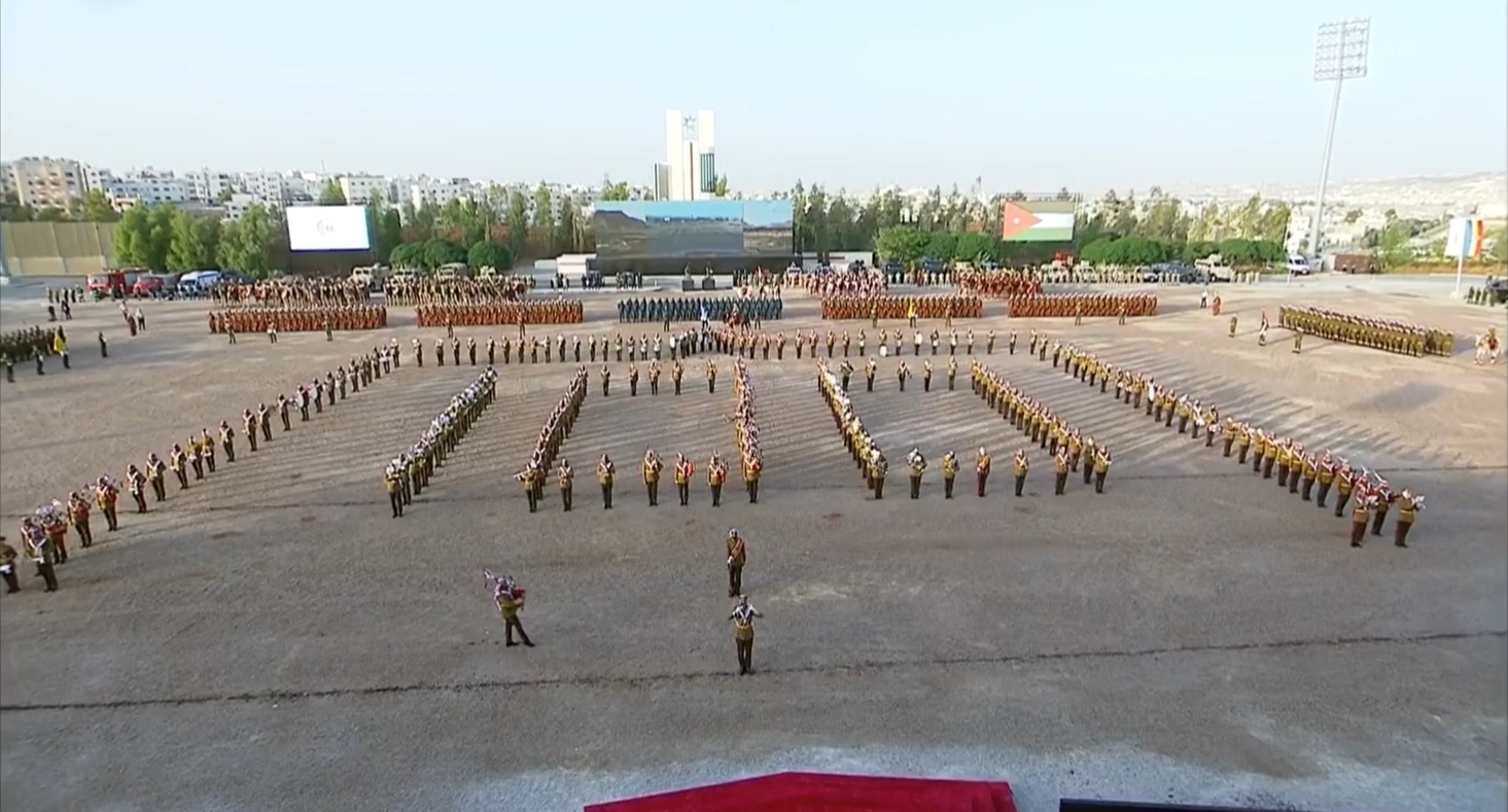 وأذن جلالة الملك ببدء الاستعراض العسكري والذي تخلله عرضا لموسيقات القوات المسلحة، ووحدة المشاة الصامتة من الحرس الملكي.