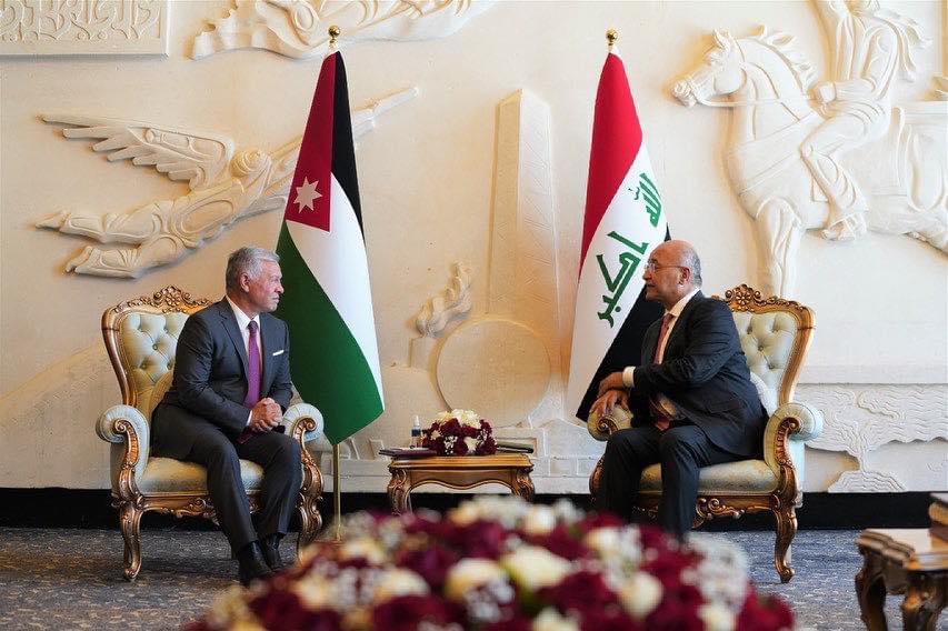 وعقد جلالة الملك والرئيس العراقي، لقاء في مطار بغداد الدولي، حيث أكدا اعتزازهما بمستوى العلاقات المتميزة التي تربط بين البلدين والشعبين الشقيقين، وحرصهما على توطيدها في شتى الميادين.