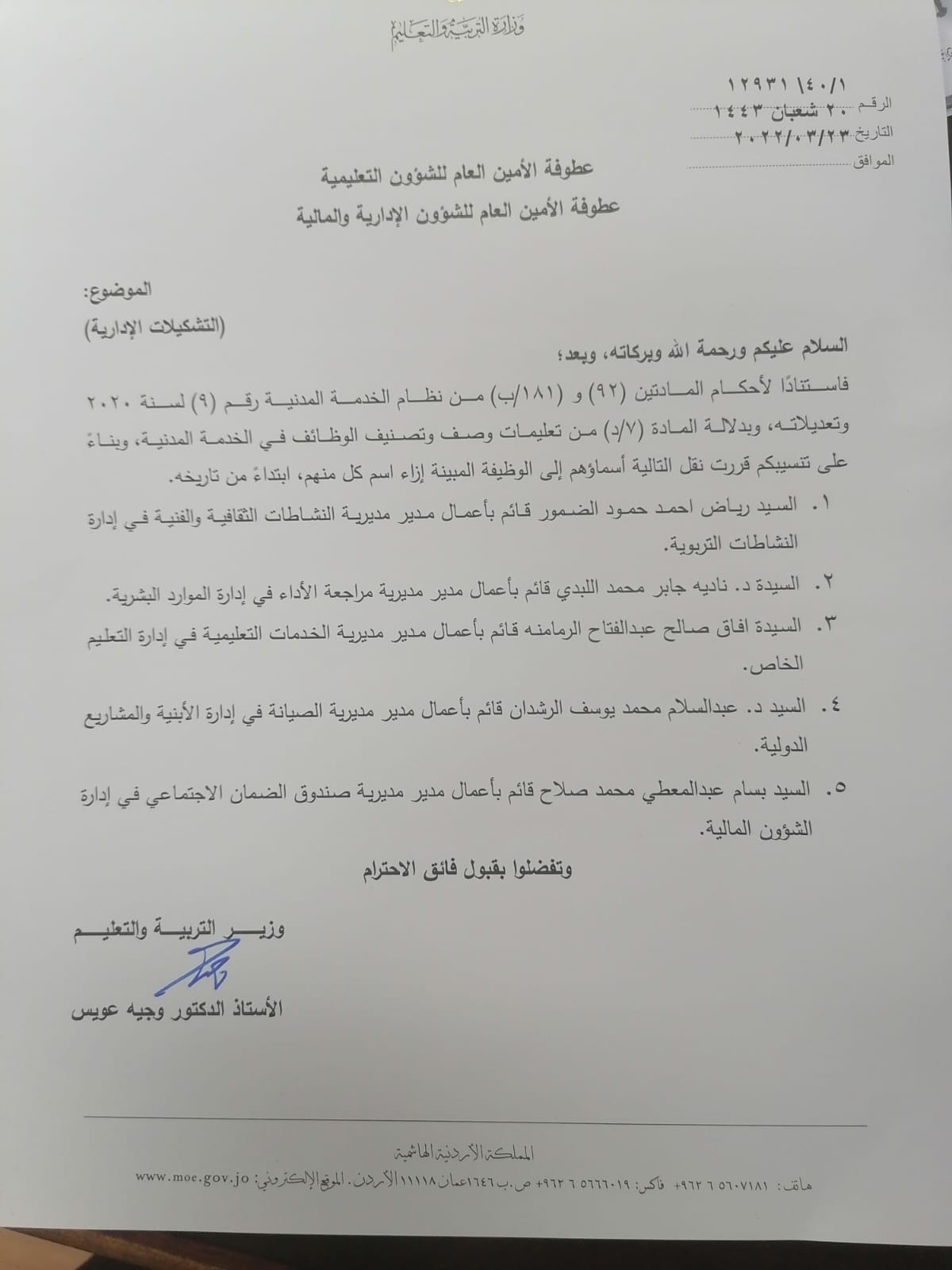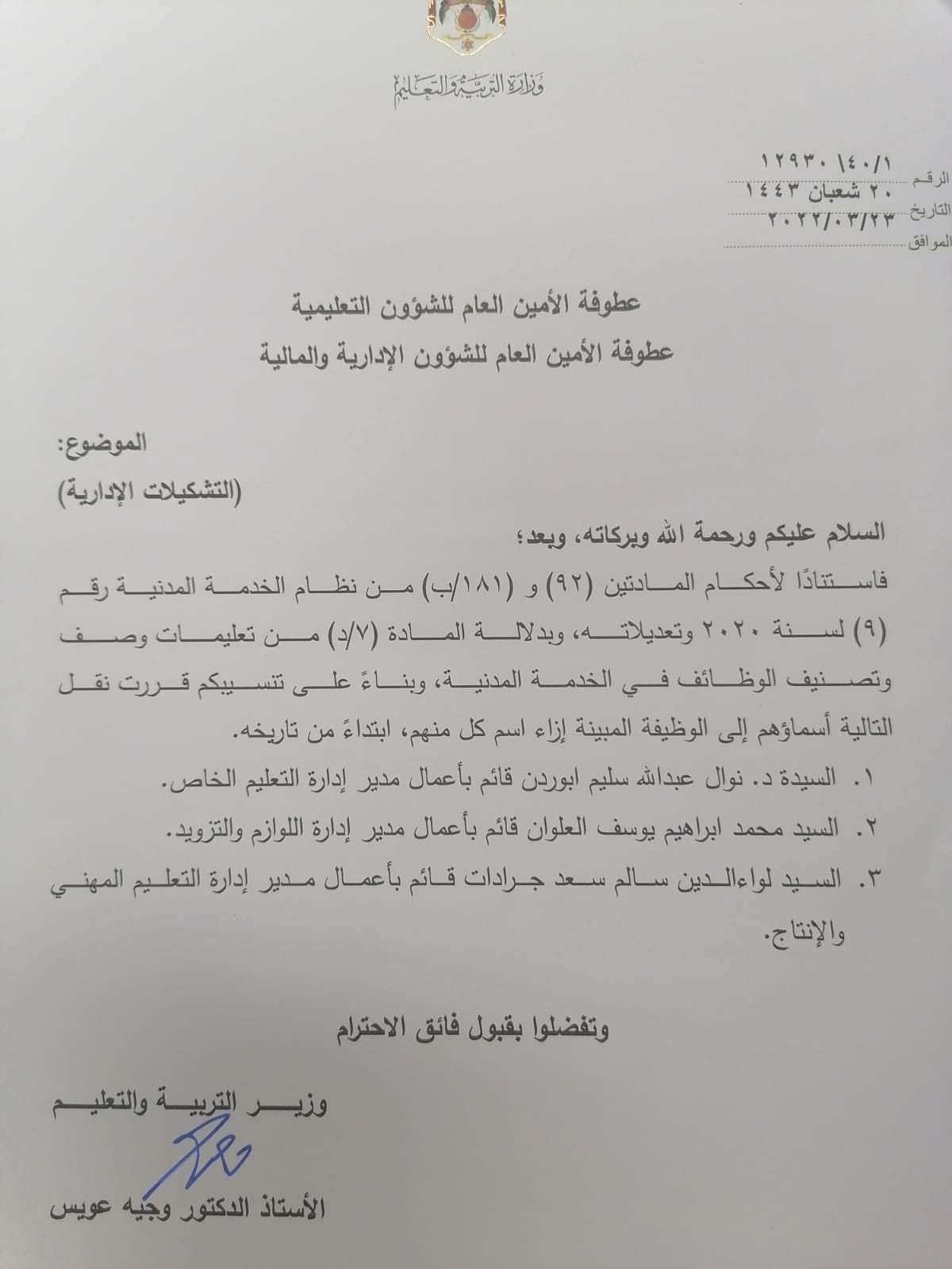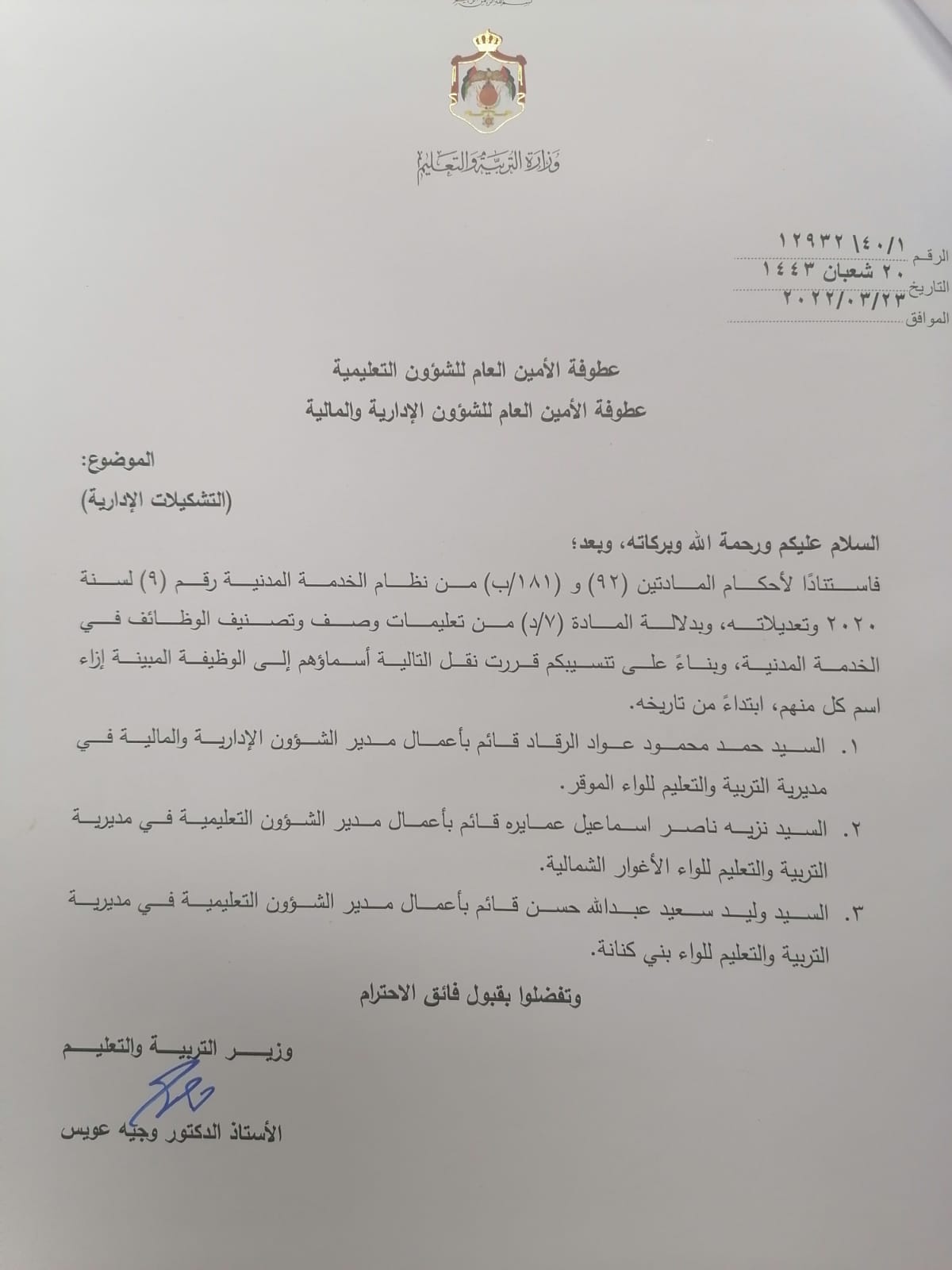 العجارمة يُنسب باجراء تشكيلات ادارية في التربية وعويس يوافق عليها .. اسماء
