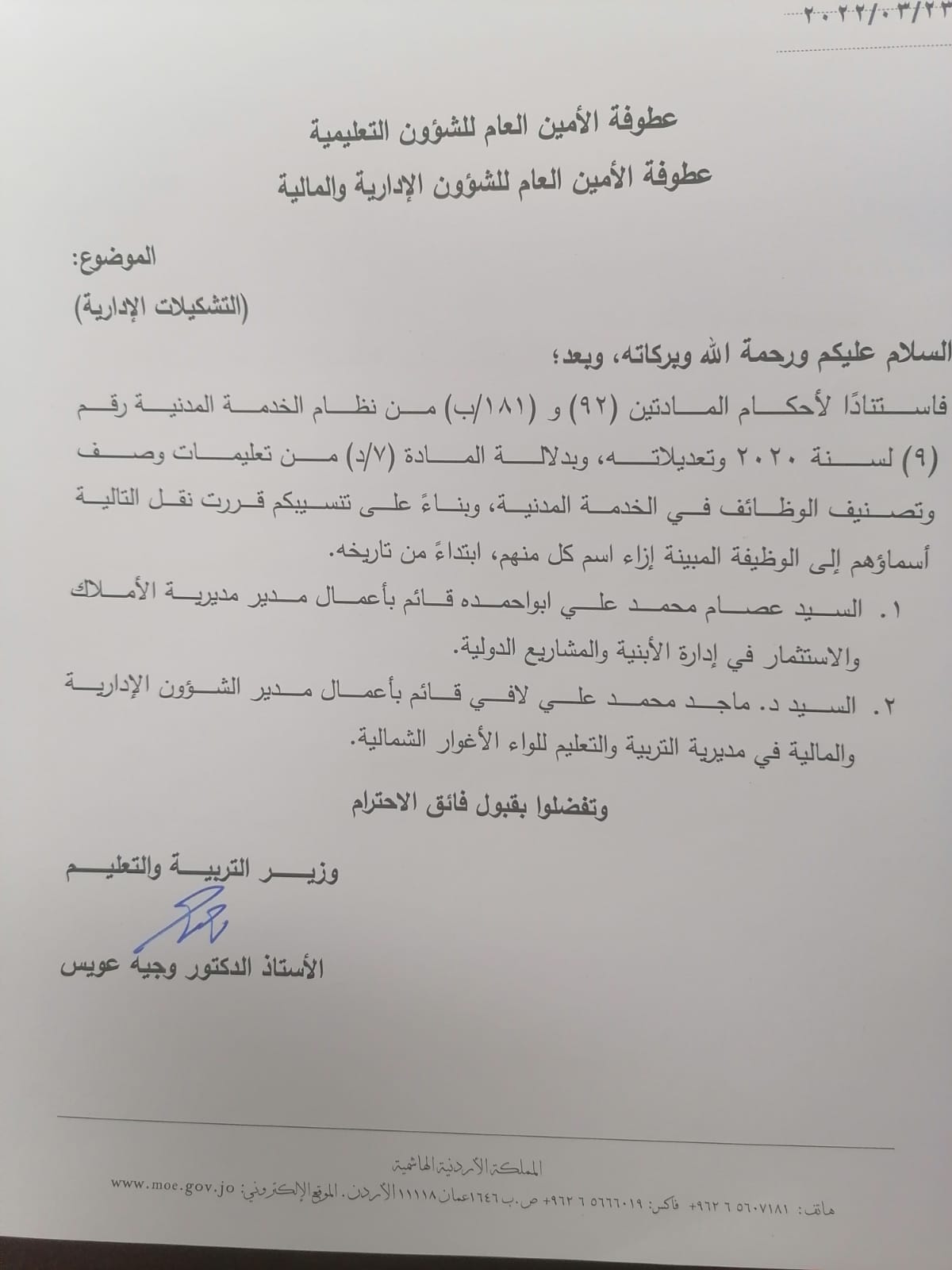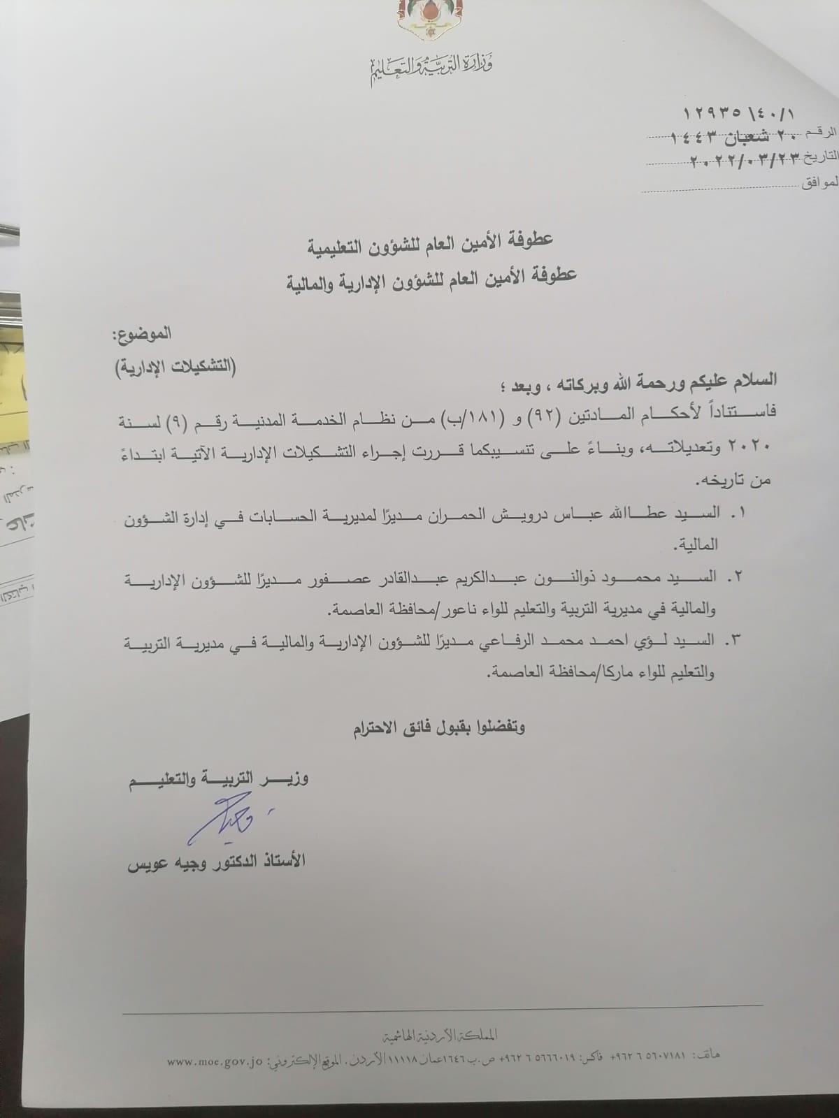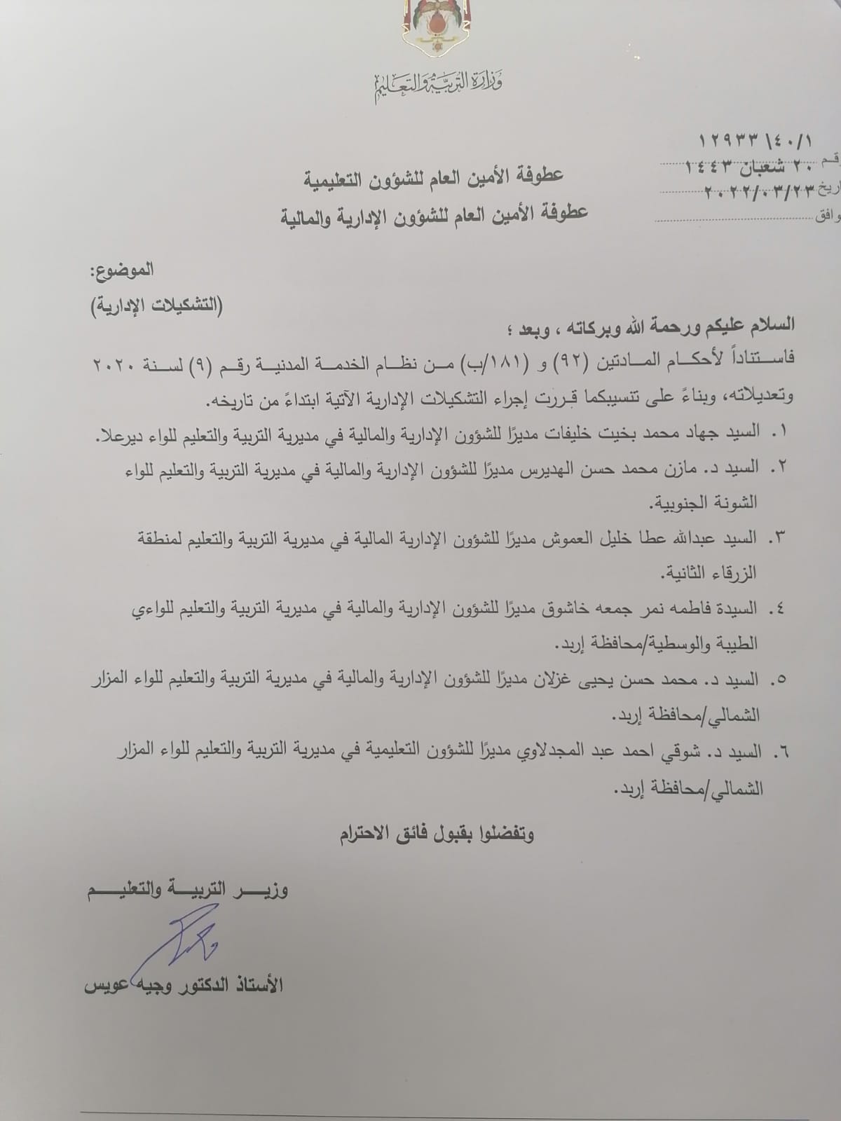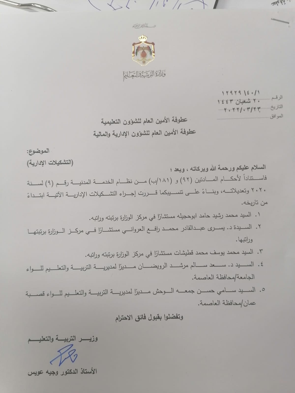 العجارمة يُنسب باجراء تشكيلات ادارية في التربية وعويس يوافق عليها .. اسماء