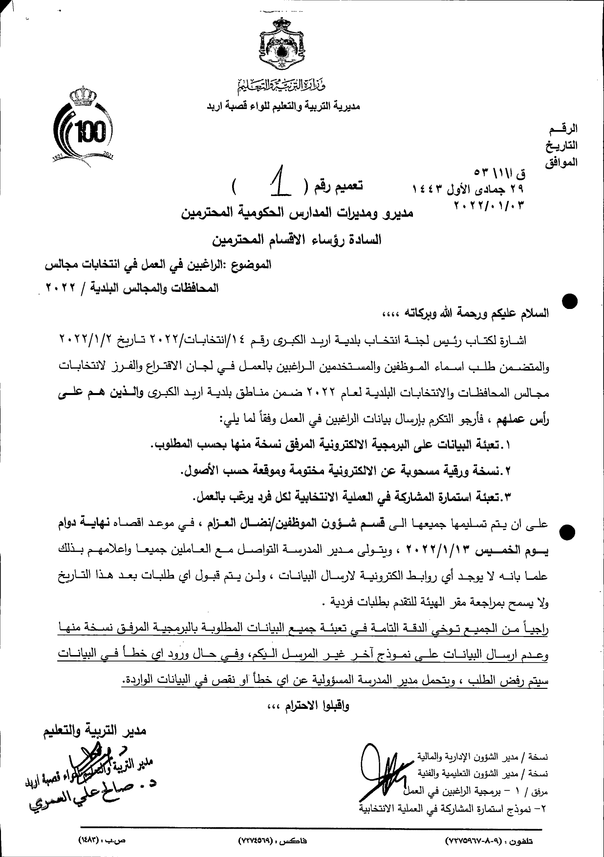 صراحة نيوز – طلبت الهيئة المستقلة للانتخاب من وزارة التربية والتعليم التعميم على الموظفين والمستخدمين الراغبين بالعمل في لجان الاقتراع والفرز لانتخابات مجالس المحافظات والانتخابات.