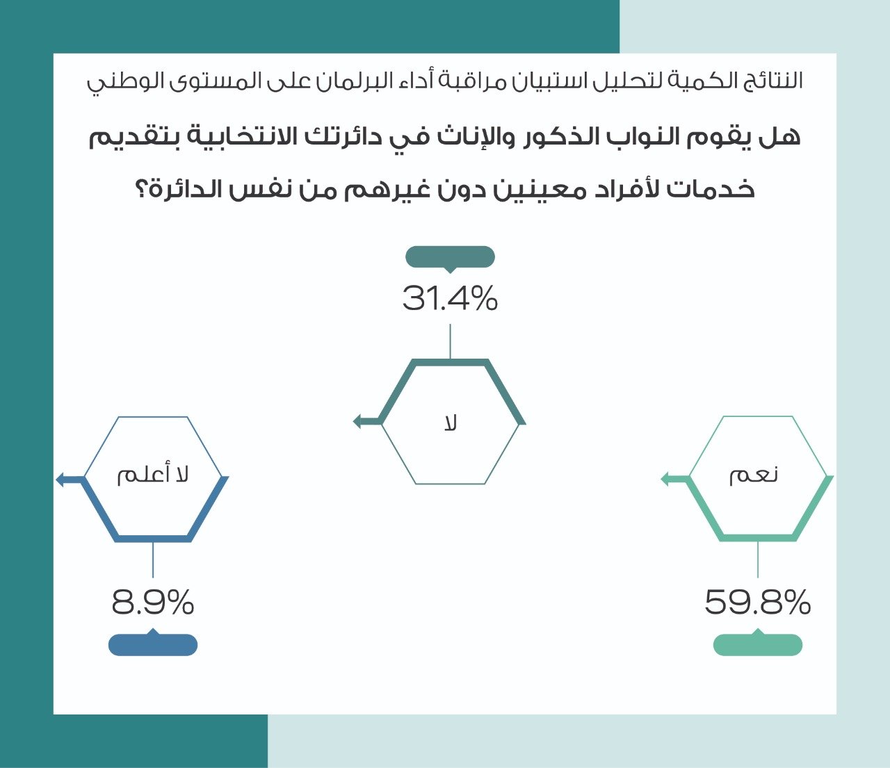 تحالف مشاركة يصدر تقريراً لمراقبة البرلمان على المستوى المحلي.50.6% من المستجيبين يعبرون عن تواصل النواب بالضعيف.56.5% من المستجيبين قالوا إنّ النواب لا يوجد لهم مكاتب رسمية في دوائرهم.5.2% من المستجيبين قالوا إنّ النواب يتواصلون معهم بشكل ممتاز بخصوص سلوكهم التصويتي داخل القبة.صراحة نيوز ‘ تزامناً مع اقتراب انتهاء العمر الدستوري لمجلس النواب الثامن عشر وقبيل بدء الانتخابات أصدر مركز نحن نشارك تقريراً حول مراقبة الأداء على المستوى المحلي؛ وذلك بهدف إطلاع الناخبين في الدوائر الانتخابية على النشاطات التي قـام بها الـنـواب خلال عمر المجلس الثامن عشر.وعمل فريق العمل على اعتماد منهجية مبنية على بناء استمارة مكونة من مجموعة من الأسئلة تضمن تواجد مؤشرات لقياس الأداء البرلماني على المستوى المحلي، وتمّ استهداف فئات مختلفة مثل أعضاء في منظمات المجتمع المدني/المحلي، والأحزاب، والمجالس البلدية، ومجلس المحافظة، وعاملون في القطاع الحكومي، وأكاديميون، وأعضاء من نقابة المحامين، والمهندسين، والأطباء، والمعلمين، وناشطون شباب، وعاطلون عن العمل، وعاملون في القطاع الخاص.وبينت نتائج التقرير أن 50.6% من المستجيبين قالوا إنّ تواصل النواب مع قواعدهم الانتخابية كان ضعيفاً، بينما قال 8% من المستجيبين إنّ التواصل كان ممتازاً، وفيما يتعلق بتواصل النواب مع قواعدهم الانتخابية بهدف مشاورتهم لاتخاذ القرارات داخل مجلس النواب عبّر 18% من المستجيبين عن التواصل بأنّه متوسط، وعبّر ما نسبته 17.2% من المستجيبين بأن التواصل مقبول، بينما قال 55.7% من المستجيبين إنّ التواصل كان ضعيفاً، ووصلت نسبة النواب الذين لا يمتلكون برامج عمل إلى 79% من البرلمانيين والبرلمانيات يمكن من خلالها متابعة أدائهم داخل البرلمان.كما أظهرت النتائج أن 56.5% من المستجيبين قالوا إنّ البرلمانيين والبرلمانيات لا يمتلكون مكاتب لهم داخل دوائرهم الانتخابية، فيما قال 11.3% إنّهم لا يعلمون إذا كان البرلمانيين والبرلمانيات يمتلكون مكاتباً لهم أم لا، وفيما يتعلق بمعرفة الناخبين بمواقع مكاتب البرلمانيين والبرلمانيات داخل دوائرهم الانتخابية أجاب 25% بأن المكاتب معروفة للناخبين فيما وصلت نسبة الذين قالوا إنّ المكاتب غير معروفة إلى 66% من المستجيبين.وبخصوص وجود لجانٍ مجتمعية للبرلمانيين والبرلمانيات بهدف تعزيز التواصل مع القواعد الانتخابية أجاب ما نسبته 73.2% أنّه لا يوجد أيّ لجانٍ مجتمعية، فيما قال 7.3% من المستجيبين إنّهم لا يعلمون إذا كان للنواب لجان مجتمعية أم لا، بينما وصلت نسبة المستجيبين الذي قالوا إنّ النواب لديهم لجان مجتمعية إلى 19.4%.كما أظهرت النتائج أنّ 51.6% من النواب يقدمون خدمات لا تمس احتياجات الدوائر التي يمثلونها من الناحية التشريعية، وأنّ 13.9% من النواب فقط يقدمون خدمات تمس احتياجات دوائرهم الانتخابية، أمّا عن الخدمات الرقابية فإنّ 50% من النواب لا يقدمون خدمات رقابية تمس احتياجات دوائرهم، و15% فقط من النواب يقدمون خدمات رقابية تمس احتياجات مناطقهم، وفيما يتعلق باحتياجات الدوائر الخدمية فإنّ 31% من النواب يقدمون خدمات تمس احتياجات دوائرهم الانتخابية من الناحية الخدمية، وفي المقابل 51% من النواب لا يقدمون خدمات تمس احتياجات المناطق التي يمثلونها.بلغت نسبة المشاركين في الإجابة عن الاستبيان من الذكور 62%، ومن الإناث 38%، وقد توزعت الفئات العمرية المشاركة كالآتي: 28% من الفئة العمرية 18-30 عام، 34% من الفئة العمرية 31-45 عام، 30% من الفئة العمرية 46-60 عام، 8% من الفئة العمرية أكبر من 60 عام.