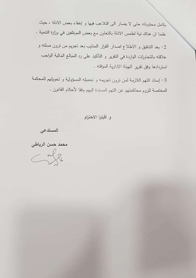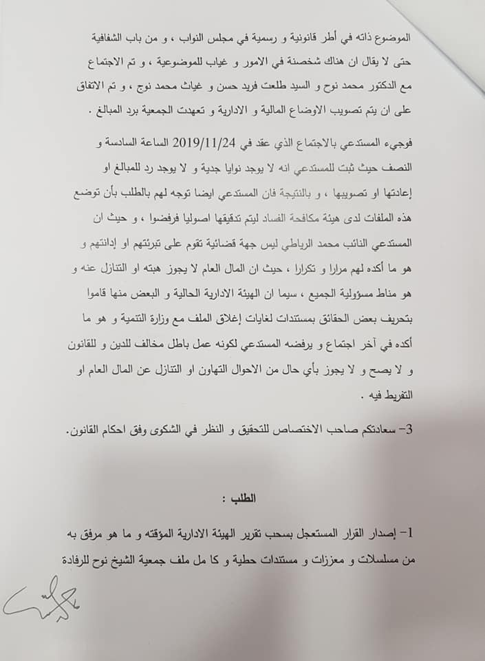 وبين أنه قدم استدعاء لهيئة النزاهة ومكافحة الفساد لدراسة القضايا والمخالفات الأخرى الموجودة على النائب القضاة، مشدداً ضرورة قيام القضاة بدفع الأموال المطلوبة منه.