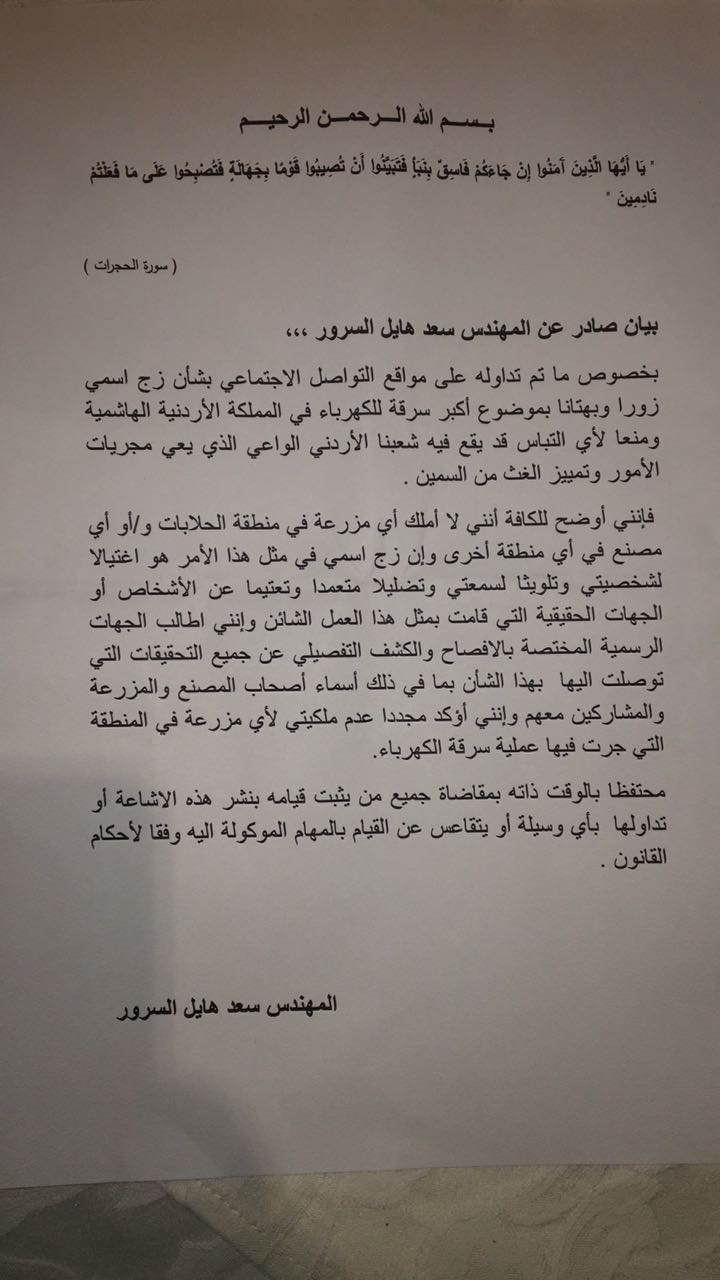 صراحة نيوز – اصدر رئيس مجلس النواب الأسبق ووزير الداخلية الأسبق المهندس سعد هايل السرور بيانا استهجن فيه زج اسمه في قضية أكبر سرقة كهرباء في تاريخ المملكة التي اشغلت الرأي العام .