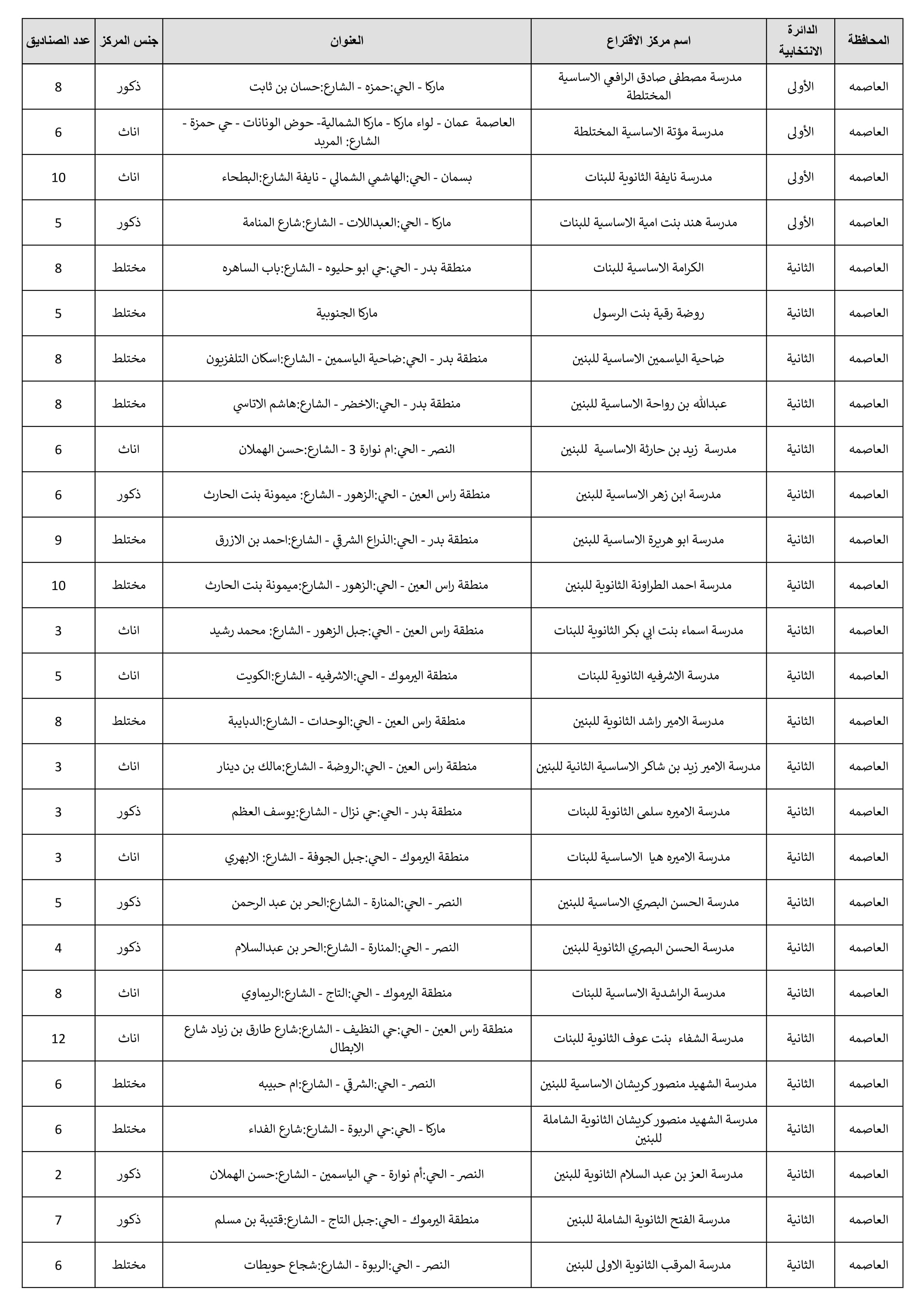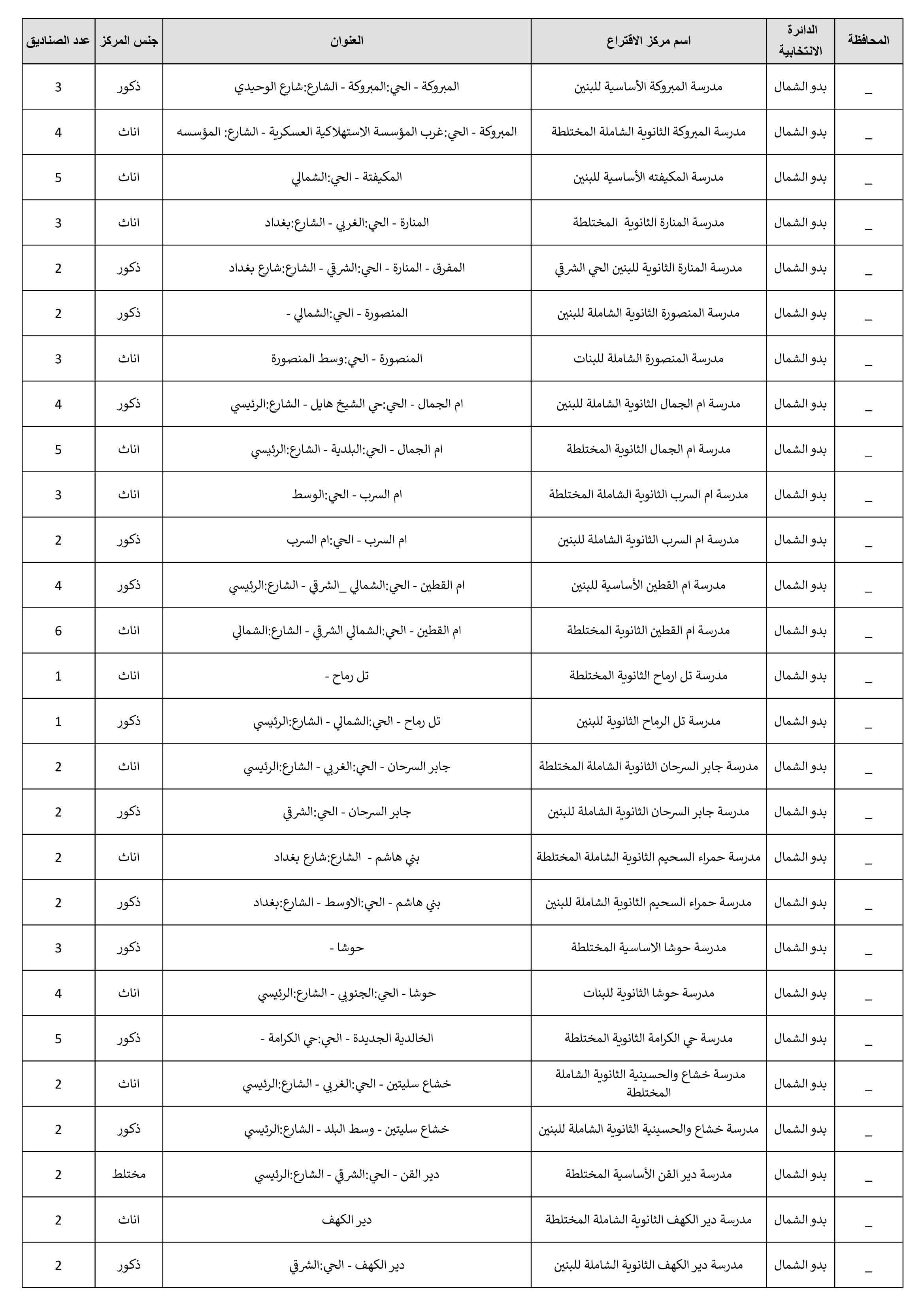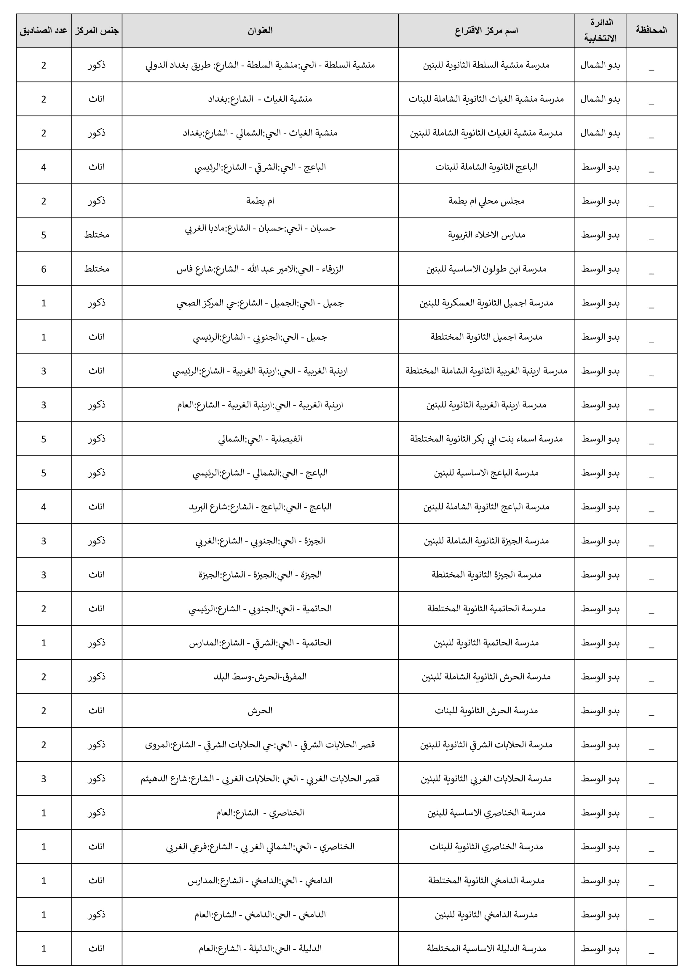 واستنادا الى أحكام الفقرة (أ) من المادة (26) من قانون الانتخاب لمجلس النواب رقم (6) لسنة 2016 وتعديله، فإنه يتوجب على الهيئة أن “تصدر قبل موعد الاقتراع بسبعة أيام على الأقل قرارا تحدد فيه مراكز الاقتراع والفرز في كل دائرة انتخابية مع بيان عدد صناديق الاقتراع والفرز في كل مركز على أن ينشر القرار على الموقع الالكتروني للهيئة وفي صحيفتين محليتين يوميتين وفي أي مكان تراه الهيئة مناسبا”.