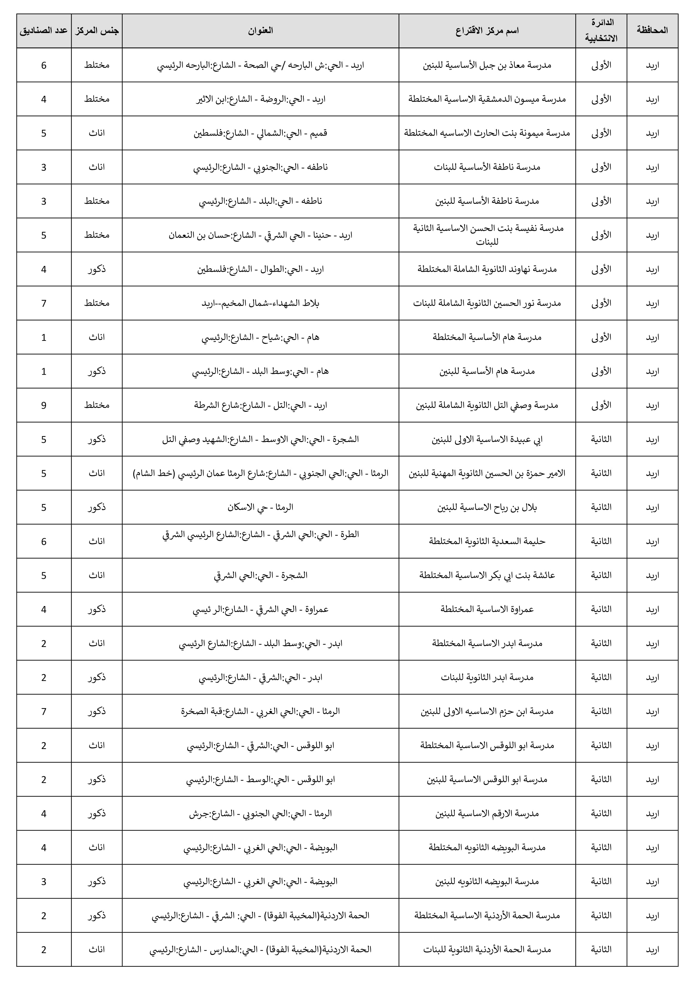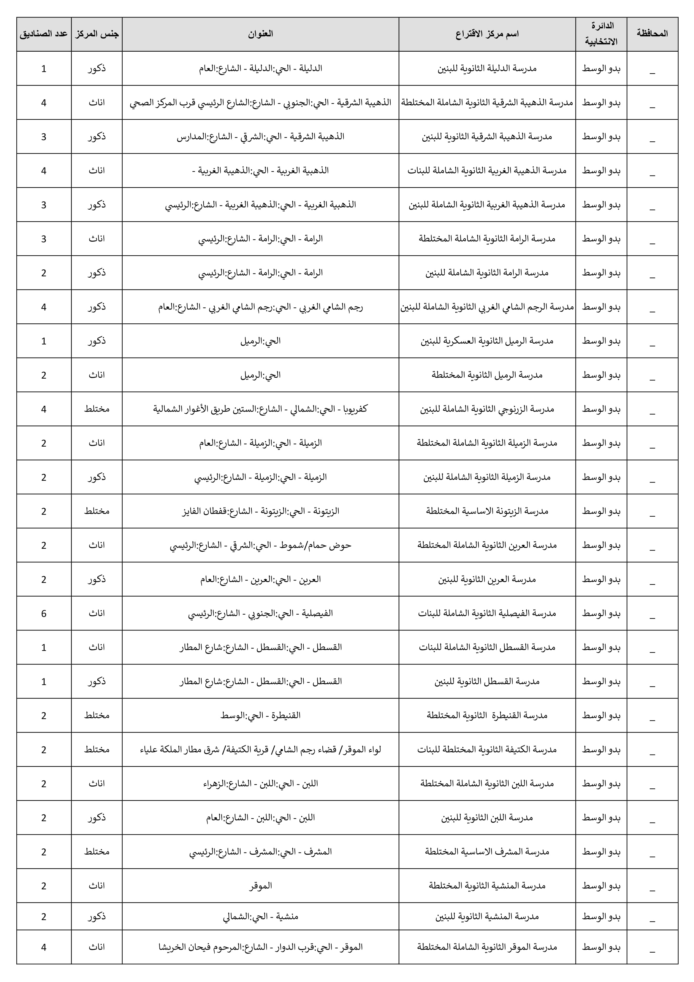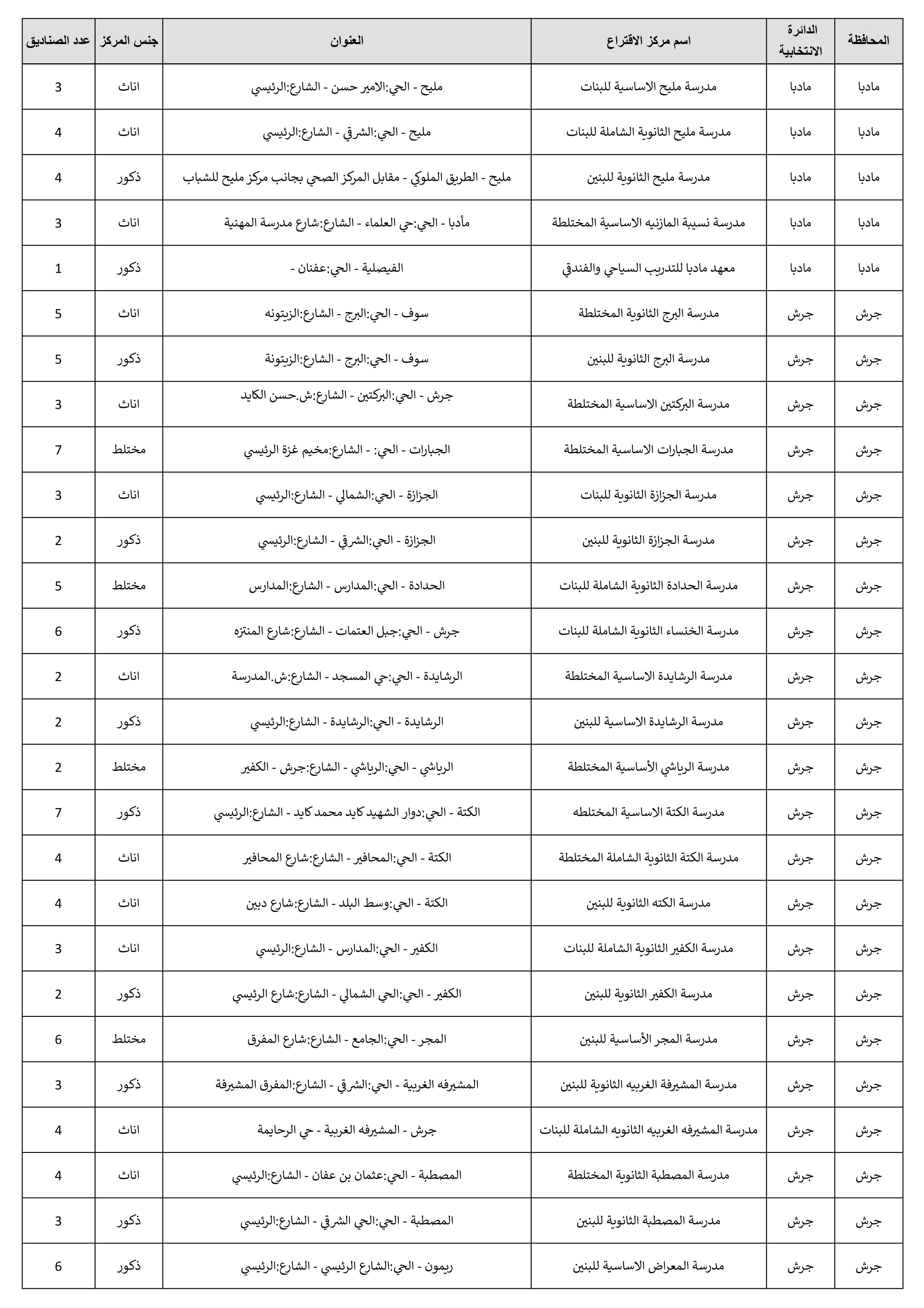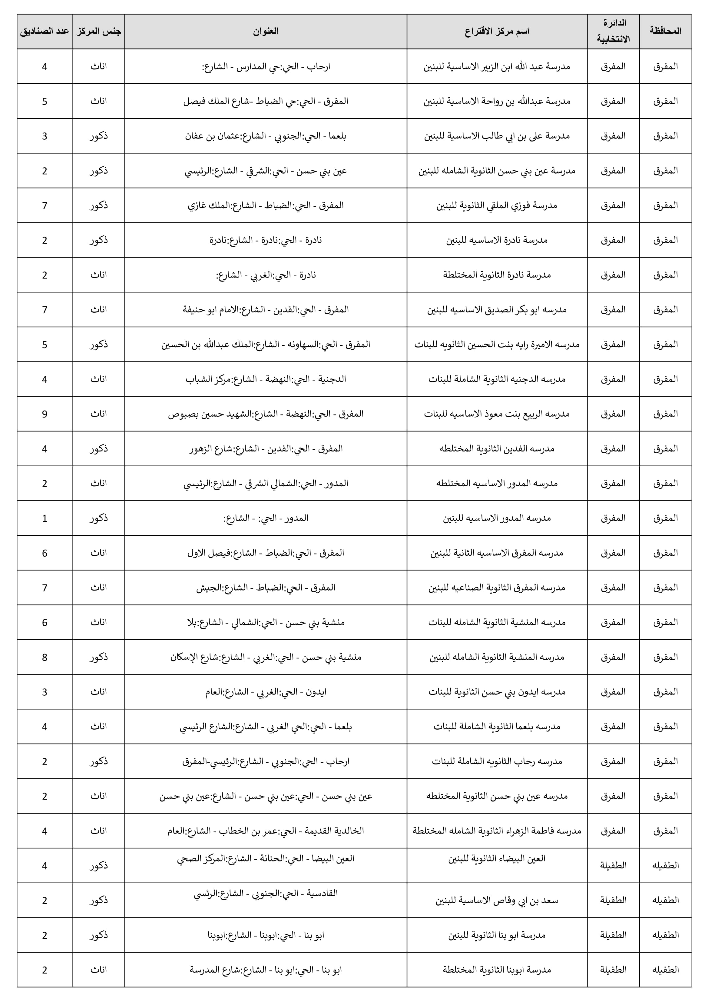 صراحة نيوز – نشرت الهيئة المستقلة للانتخاب مراكز الاقتراع والفرز في (23) دائرة انتخابية بالاضافة الى بيان عدد صناديق الاقتراع والفرز في كل مركز.
