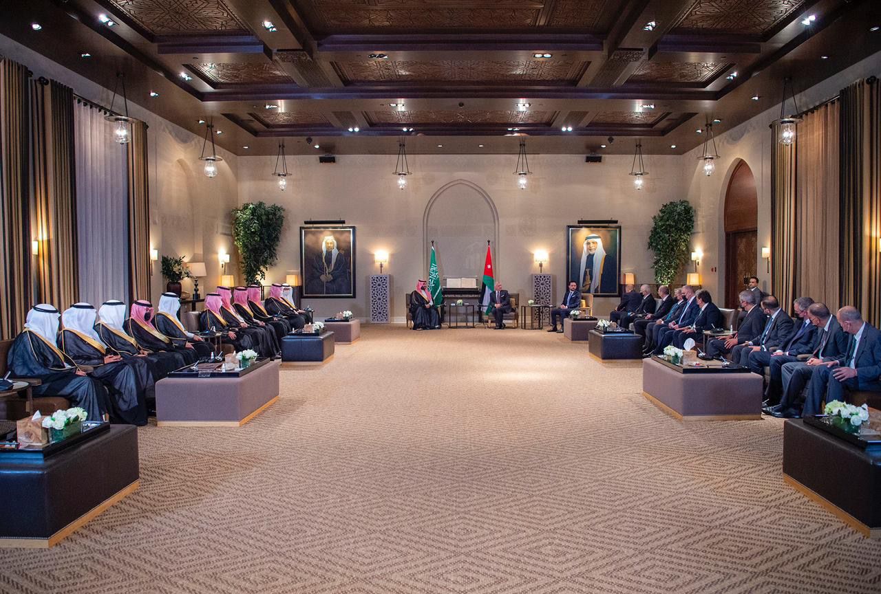وحضر المباحثات رئيس الوزراء الدكتور بشر الخصاونة، ورئيس الديوان الملكي الهاشمي يوسف حسن العيسوي، ونائب رئيس الوزراء ووزير الخارجية وشؤون المغتربين أيمن الصفدي، ومدير مكتب جلالة الملك، الدكتور جعفر حسان، ووزراء التخطيط والتعاون الدولي ناصر الشريدة، والنقل المهندس وجيه عزايزة، والطاقة والثروة المعدنية الدكتور صالح الخرابشة، والمالية الدكتور محمد العسعس، والشباب محمد النابلسي، والداخلية مازن الفراية، والصناعة والتجارة والتموين يوسف الشمالي، والسفير الأردني في الرياض علي الكايد.
