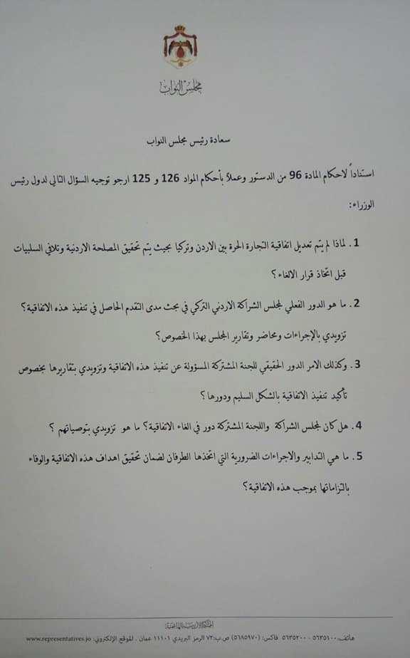 جاء ذلك ضمن سؤال نيابي وجهه اليوم حيث طلب معرفة الدور الفعلي لمجلس الشراكة الأردني التركي في بحث مدى التقدم الحاصل في تنفيذ هذه الاتفاقية، وما هو الدور الحقيقي للجنة المشتركة المسؤولة عن تنفيذ هذه الاتفاقية والعمل على تزويده بتقاريرها بخصوص تأكيد تنفيذ الاتفاقية بالشكل السليم،وما هي التدابير والاجراءات الضرورية التي اتخذها الطرفان لضمان تحقيق أهداف هذه الاتفاقية والوفاء بالتزاماتها بموجب هذه الاتفاقية.
