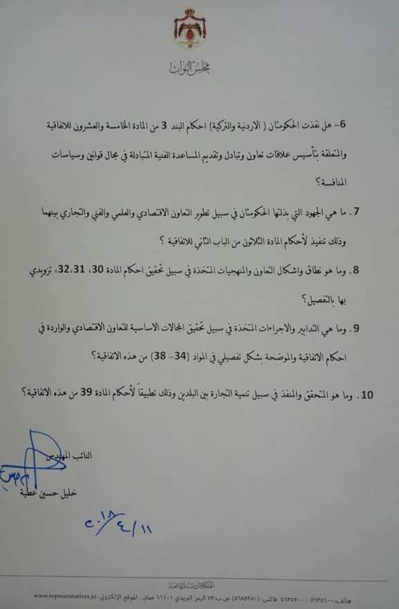 كما تسائل النائب عطية معرفة هل نفذت الحكومتان (الأردنية والتركية) أحكام البند 3 من المادة الخامسة والعشرون للاتفاقية المتعلقة بتأسيس علاقات تعاون وتبادل وتقديم المساعدة الفنية المتبادلة في مجال قوانين وسياسات المنافسة،وما هي الجهود التي بذلتها الحكومتان في سبيل تطوير التعاون الاقتصادي والعلمي والفني والتجاري بينهما وذلك تنفيذ لأحكام المادة الثلاثين من الباب الثاني للاتفاقية.