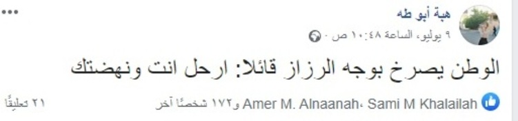 صراحة نيوز – وجهت الزميلة الإعلامية والناشطة هبه أبو طه على صفحة الفيسبوك خاصتها رسالة قصيرة الى رئيس الحكومة عمر الرزاز من ثلاث كلمات هي ” ارحل انت ونهضتك ”