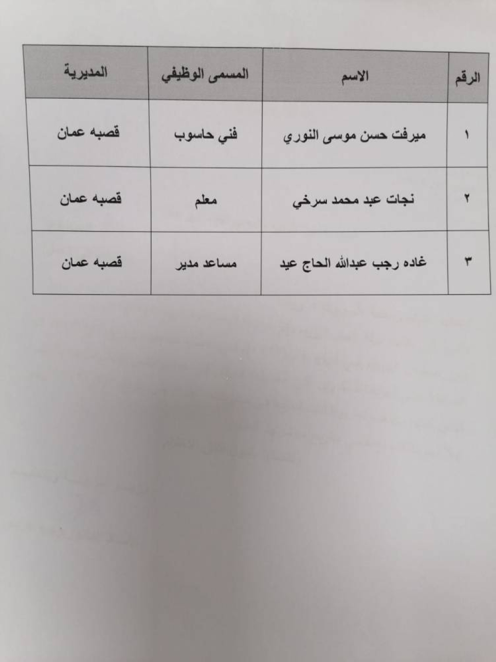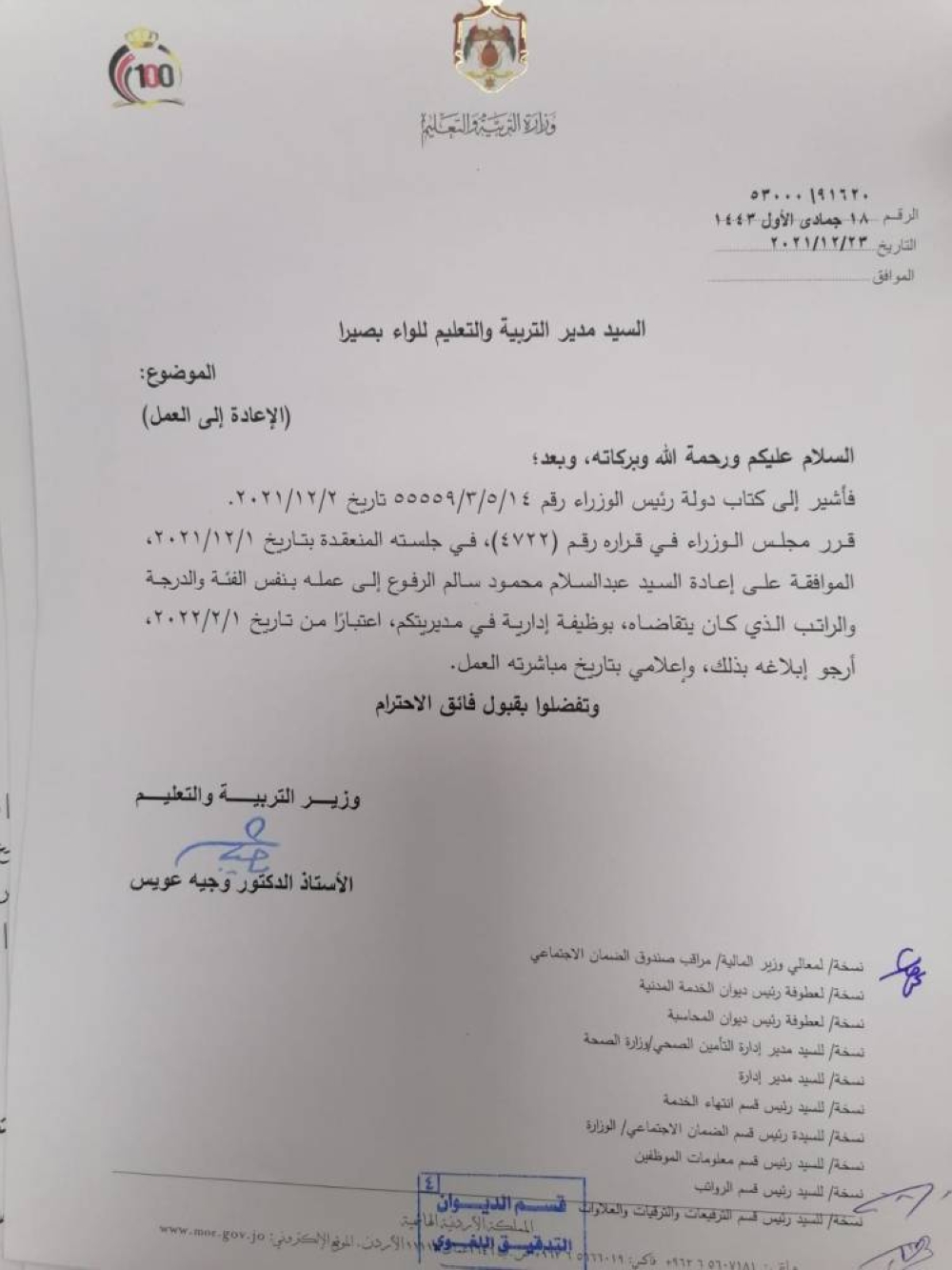 صراحة نيوز – قرر وزير التربية والتعليم الدكتور وجيه عويس إعادة عدد من الموظفين الى العمل اعتبارا من تاريخ 1/2/2022.