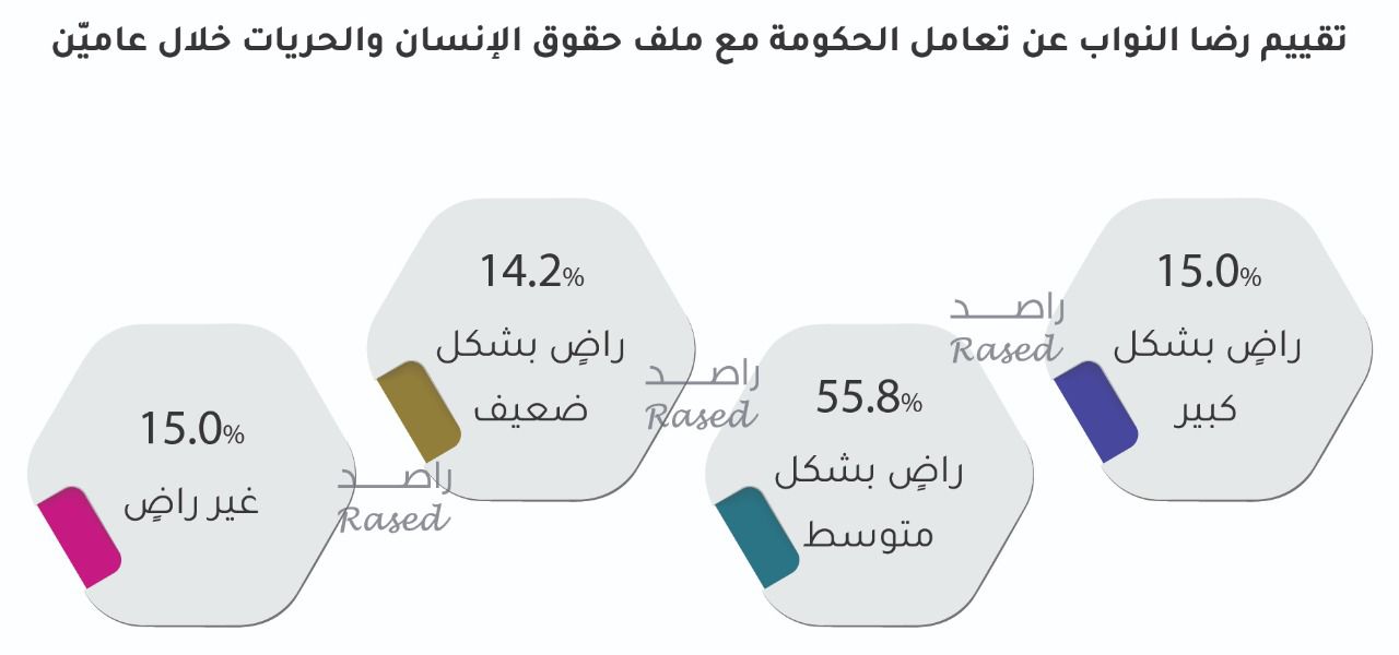 وفيما يخص حالة الحريات وحقوق الإنسان، تبين أن 15% راضون بشكل كبير و55,8% راضون بشكل متوسط، فيما كانت نسبة النواب الراضون بشكل ضعيف 14,2%، و15% من النواب غير راضين.