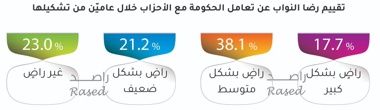 وبخصوص تعامل الحكومة مع الأحزاب السياسية قال 17,7% من النواب أنهم راضون بشكل كبير، وأبدى 38,1% رضاهم بشكل متوسط، بينما قال 21,2% أنهم راضون بشكل ضعيف، و23% قالوا أنهم غير راضين عن تعامل الحكومة مع الأحزاب السياسية.
