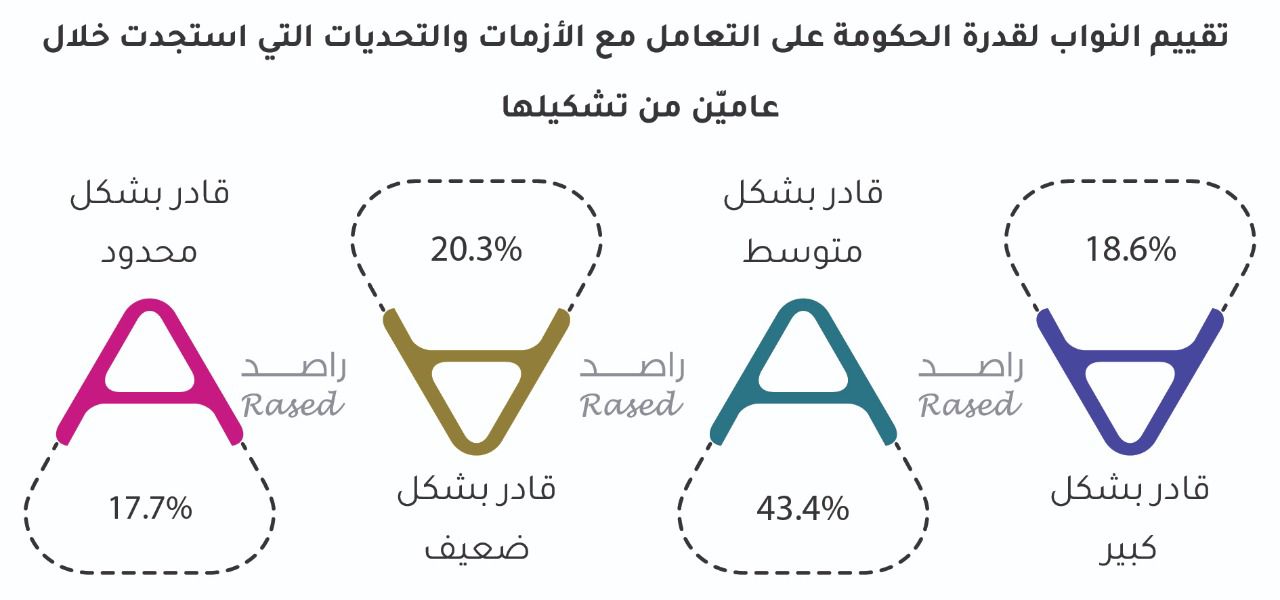 وعلى صعيد آراء النواب حول تعامل الحكومة في الأزمات والتحديات التي استجدت ومرت بها، قال 18,6% من النواب أن الحكومة كانت قادرة بشكل كبير، فيما قال 43,4% أنها قادرة بشكل متوسط، و20,3% قالوا إنها قادرة بشكل ضعيف، و17,7% قالوا أنها كانت قادرة بشكل محدود، وبخصوص ملف التشغيل والبطالة فقد تبين أن 2,7% من النواب راضون بشكل كبير، و12,4% راضون بشكل متوسط، و38,9% منهم راضون بشكل ضعيف، وقال 46% من النواب أنهم غير راضين.