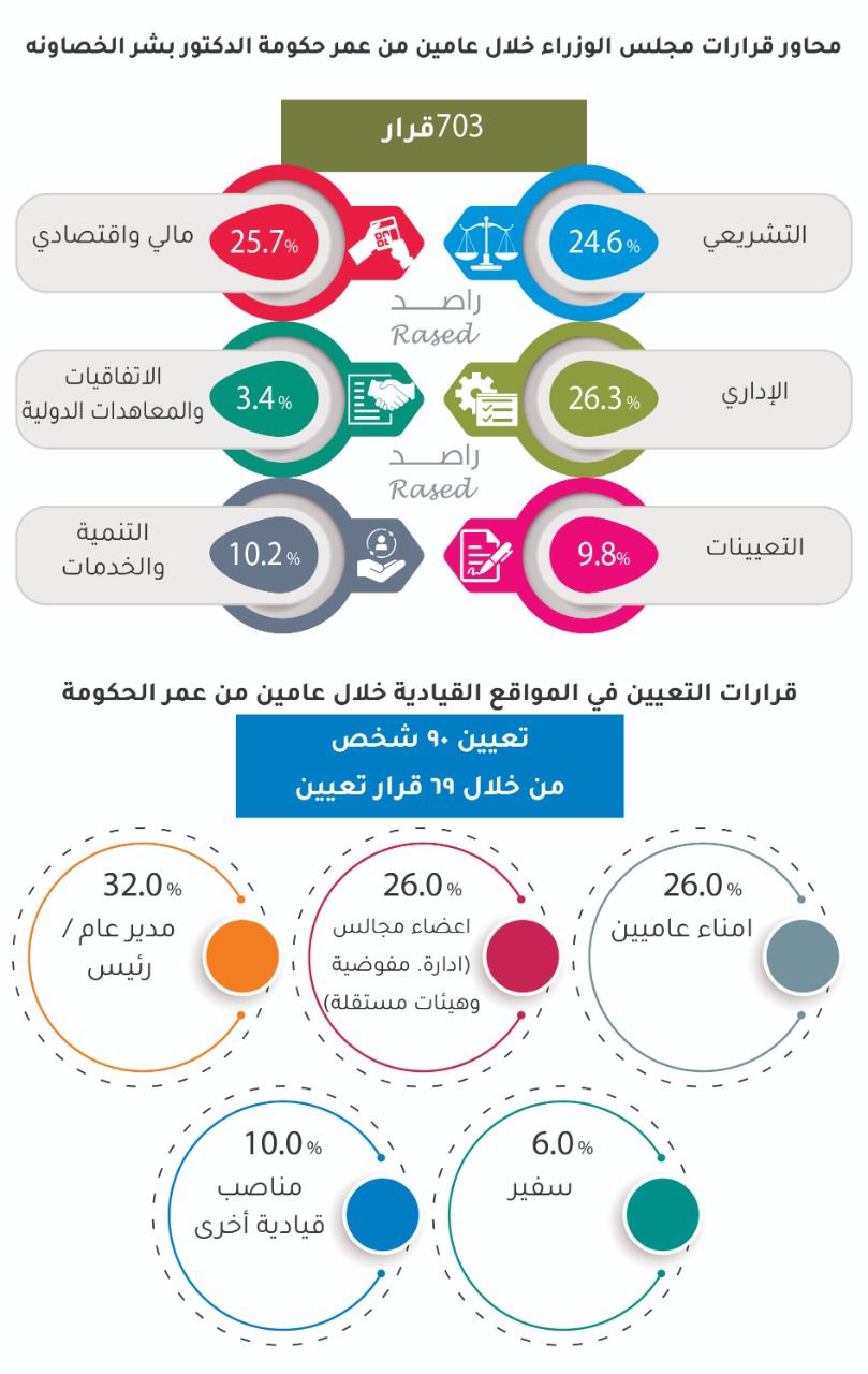 وبلغت قرارات التعيين في المناصب القيادية الصادرة عن مجلس الوزراء 69 قرارًا خلال عامين، تم تعيين 90 شخصاً بموجب هذه القرارات، علماً بأن التعيينات التي تم اعتمادها هي التعيينات في المناصب القيادية، حيث تم تعيين 18 أمين عام، و16 شخصاً بموقع مدير عام، وتم تشكيل وإعادة تشكيل مجالس مفوضين وإدارة حيث تم تعيين 23 شخصاً فيها، وبمنصب رئيس تنفيذي أو رئيس مجلس تم تعيين 6 أشخاص، و4 بموقع سفير علماً بأنهم كانوا يشغلون مناصب خارج ملاك وزارة الخارجية قبيل تعيينهم، وتم تعيين محافظاً للبنك المركزي، وأميناً لعمان، ووكيلاً عاماً لإدارة قضايا الدولة، و20 شخصاً تم تعيينهم أعضاءً في مجالس إدارة ومفوضية وهيئات مستقلة.