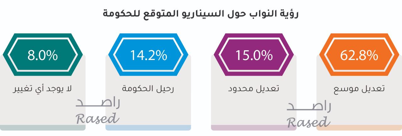 وبينت النتائج أن 14,2% من النواب يروم أن الحكومة راحلة، بينما يرى 85,8% من النواب يرون أن الحكومة باقية، حيث يرى 62,8% من النواب أنه سيجري تعديل موسع على الحكومة، بينما يرى 15% أنه سيجرى تعديل محدود على الحكومة، و8% يرون أنه لن يكون هنالك أي تعديل أو تغيير على الحكومة، فيما يرى 14,2% من النواب أن الحكومة راحلة.