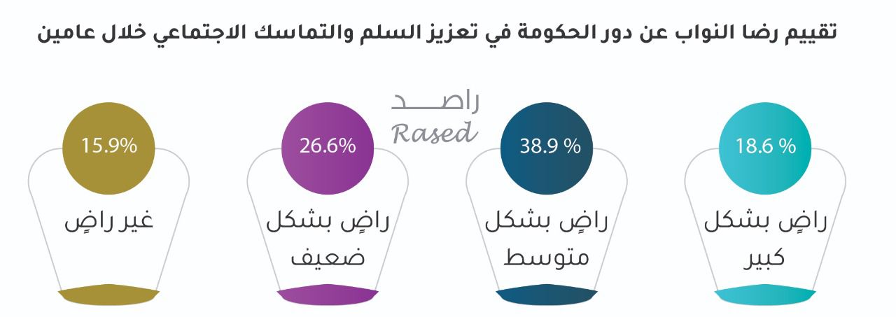 وحول رضا النواب عن دور الحكومة في تعزيز السلم والتماسك المجتمعي قال 18,6% من النواب أنهم راضون بشكل كبير، ونسبة الراضون بشكل متوسط 38,9%، فيما قيّم 26,6% من النواب رضاهم بشكل ضعيف، و15,9% غير راضين.