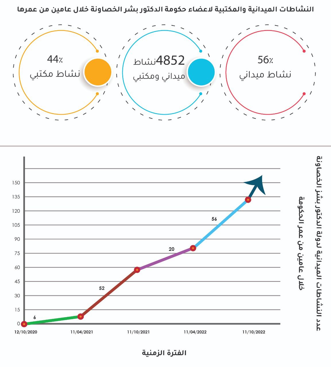وعمل فريق إعداد التقرير على تتبع كافة أنشطة أعضاء حكومة الخصاونة خلال العامين، حيث بلغ مجموع النشاطات الميدانية والمكتبية 4852 نشاطًا، وتم رصد 134 نشاطًا ميدانيًا لرئيس الوزراء، وكان أكثر الوزراء تنفيذًا للأنشطة الميدانية وزير الزراعة بواقع 211 نشاطاً ميدانياً، تلاه وزير الثقافة بـ 191 نشاطًا ميدانيًا، ووزير السياحة والآثار ب 178 نشاطًا ميدانيًا ووزير الإدارة المحلية والشؤون السياسية والبرلمانية بـ 176 نشاط، تلاه وزير الشباب بواقع 153 نشاطاً، ثم وزير التنمية الاجتماعية بواقع 151 نشاطاً، علماً بأن منهجية إعداد التقرير استثنت وزير الخارجية ووزراء الدولة من تعداد الأنشطة، وأظهر التقرير أن عدد سفرات أعضاء حكومة الخصاونة خلال الفترة 12/10/2020 لغاية 11/10/2022 بلغ 248 سفرة.