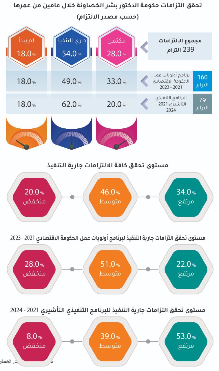 وفي ذات السياق تضمن التقرير تتبعاً للالتزامات المرتبطة بإطار زمني ضمن برنامج أولويات عمل الحكومة الاقتصادي ليتبين أن 43% من الالتزامات التي انتهت مدتها الزمنية اكتملت، فيما يجري تنفيذ 47% من الالتزامات التي انتهت مدتها الزمنية، ولم يبدأ تنفيذ ما نسبته 10% منها، ومن الجدير ذكره من 5% من الالتزامات التي لم تنتهي فترتها الزمنية اكتملت، و57% جاري تنفيذها، و38% لم يبدأ بعد.