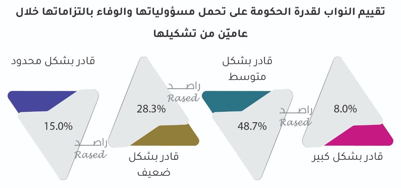 وأظهرت النتائج أن 8% من النواب يرون أن الفريق الوزاري كان قادراً على تحمل مسؤولياته والوفاء بالتزاماته بشكل كبير، فيما يرى 48,7% من النواب أنه كان قادراً بشكل متوسط، ونسبة الذين يرونه كان قادراً بشكل ضعيف 28,3%، أما نسبة الذين يرونه كان قادراً بشكل محدود 15%.