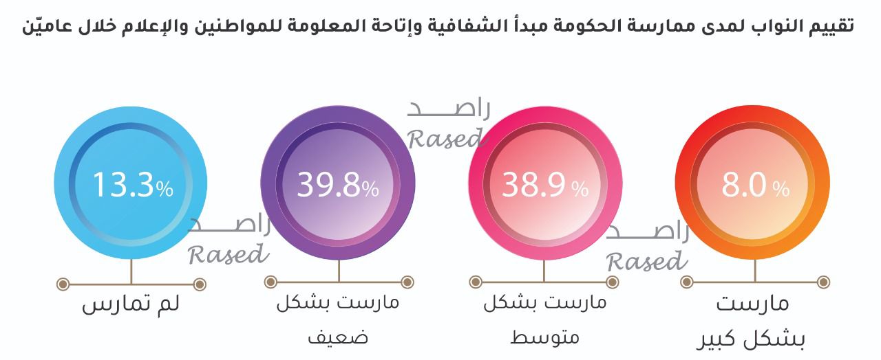 أما تقييم النواب للحكومة حول ممارستها الشفافية وإتاحة المعلومات للمواطنين، فقد قال 8% من النواب أن الحكومة مارستها بشكل كبير، والذين يرونها أنها مارستها بشكل متوسط 38,9%، فيما يرى 39,8% أنها مارستها بشكل ضعيف، و13,3% يرون أنها لم تمارسها.