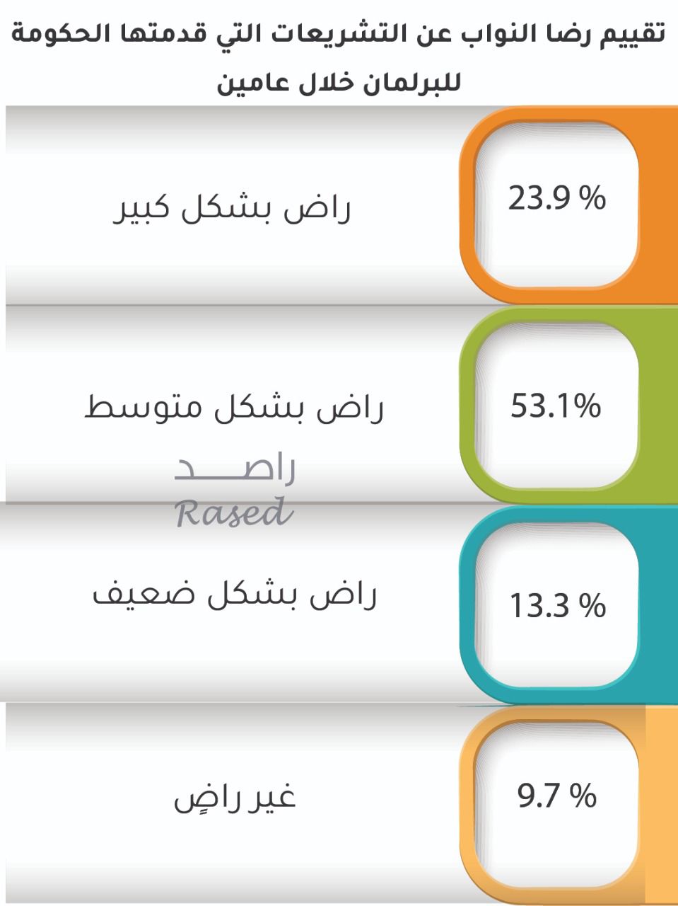 وقال 23,9% من النواب أنهم راضون بشكل كبير عن التشريعات التي تقدمها الحكومة للبرلمان، بينما كانت نسبة الراضين بشكل متوسط 53,1%، ووصلت نسبة النواب الراضون بشكل ضعيف عن التشريعات التي تقدمها الحكومة 13,3%، بينما كانت نسبة غير الراضين 9,7%.