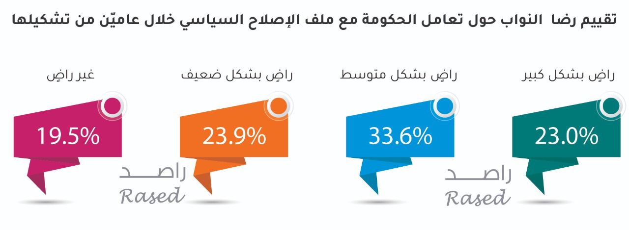 أما حول رضى النواب حول تعامل الحكومة مع ملف الإصلاح السياسي، تبين أن نسبة الراضون بشكل كبير 23% بينما كانت نسبة الراضون بشكل متوسط 33,6%، و23,9% راضون بشكل ضعيف، و19,5% غير راضين.