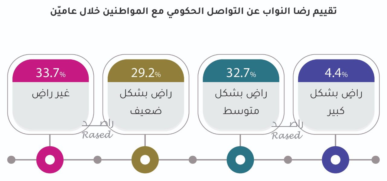 وبما يتعلق في التواصل الحكومي مع المواطنين، قال 4,4% من النواب أنهم راضون بشكل كبير، و32,7% راضون بشكل متوسط، وتبين أن 29,2% راضون بشكل ضعيف، فيما كانت نسبة غير الراضين 33,7% من النواب.