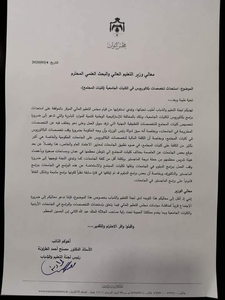 تهديكم لجنة التعليم والشباب أطيب تحياتها، وتبدي استغرابها من قيام مجلس التعليم العالي الموقر بالموافقة على استحداث برامج بكالوريوس للكليات الجامعية، وذلك بالمخالفة للاستراتيجية الوطنية لتنمية الموارد البشرية والتي تدعو إلى ضرورة تخصيص كليات المجتمع للتخصصات التطبيقية المهنية التي ترفد سوق العمل وعلى نحو يختلف فيه عن التخصصات المطروحة في الجامعات، وبخاصة أنه سبق لدولة رئيس الوزراء وأن وجه الحكومة بضرورة وقف تخصصات البكالوريوس في كليات المجتمع، وبخاصة أن الكلفة المالية لتخصصات البكالوريوس على الجامعات الحكومية والخاصة هي أكبر بكثير من الكلفة على كليات المجتمع، في ضوء تطبيق الجامعات لمعايير الاعتمادين العام والخاص، هذا وفضلا عن بعد موقع بعض الجامعات عن العاصمة بخلاف كليات المجتمع التي تتوطن معظمها في عمان وبمساحات صغيرة وبأعضاء هيئة تدريس معظمهم من حملة درجة الماجستير وبكلفة أقل من كلفة الجامعات، كما وتبدي اللجنة توجهها إلى ضرورة وقف العمل ببرامج الدبلوم في الجامعات ونقلها لكليات المجتمع والاستعاضة عن هذه البرامج في الجامعات ببرامج الماجستير والدكتوراة، وبخاصة أن بعض برامج الدبلوم قد تم إيقافها في فترة سابقة نظرا لكونها برامج مشبعة وتشكل التفافا قانونيا على برامج الماجستير في الجامعات.