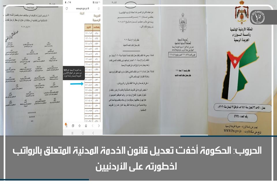 وحصلت الدائرة القانونية –بحسب الحروب- على نسخة ورقية من العدد رقم (5635) من الجريدة الرسمية والصادرة بتاريخ 19- نيسان -2020، إذ أن النظام المعدل ورد فيها العدد أي بعد قرار وقف العلاوة.