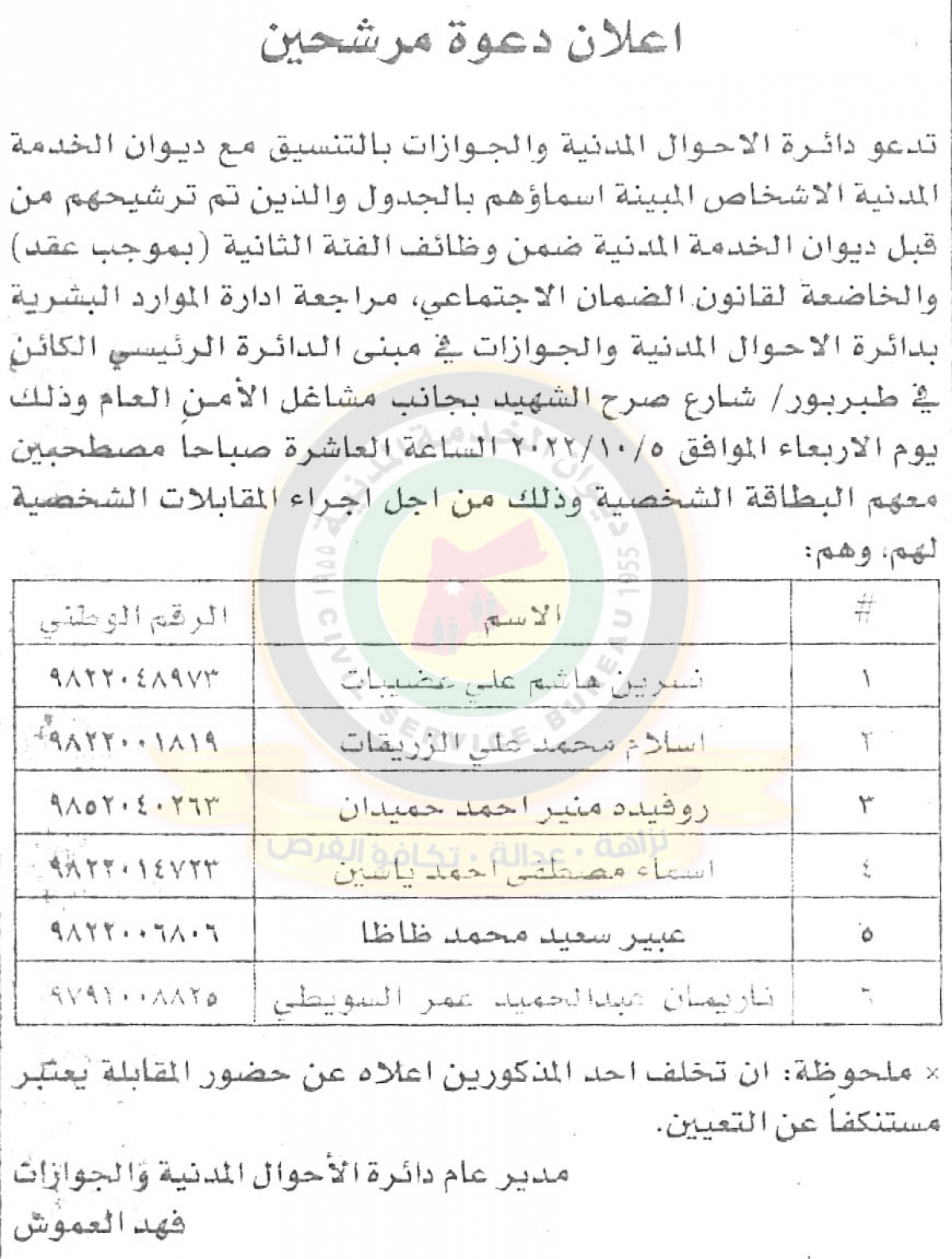 مدعون للمقابلة للتعين في الأحوال المدنية … أسماء
