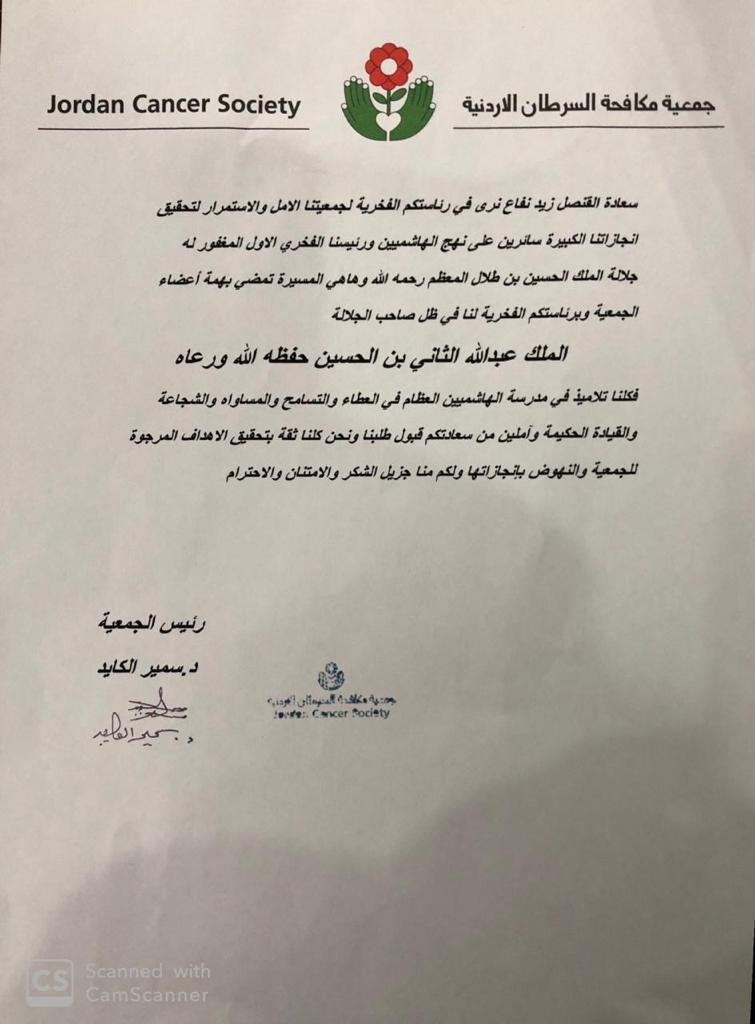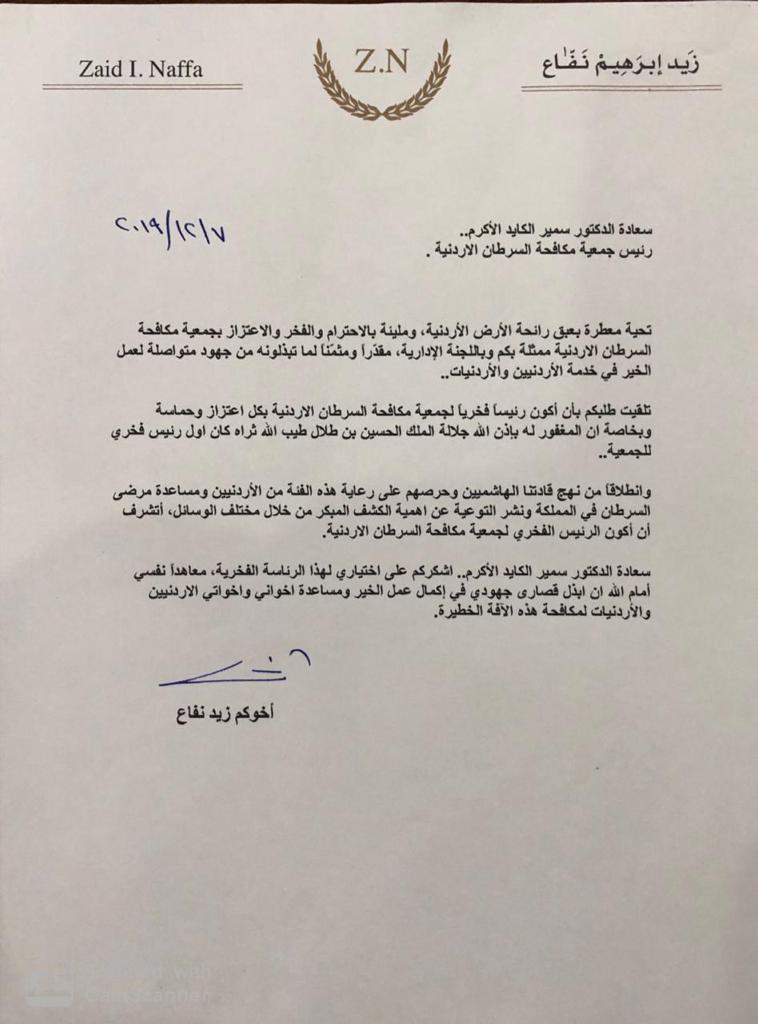 استجاب القنصل الاردني لدى هنغاريا المهندس زيد نفاع لطلب رئيس وأعضاء جمعية مكافحة السرطان الاردنية، للرئاسة الفخرية للجمعية.