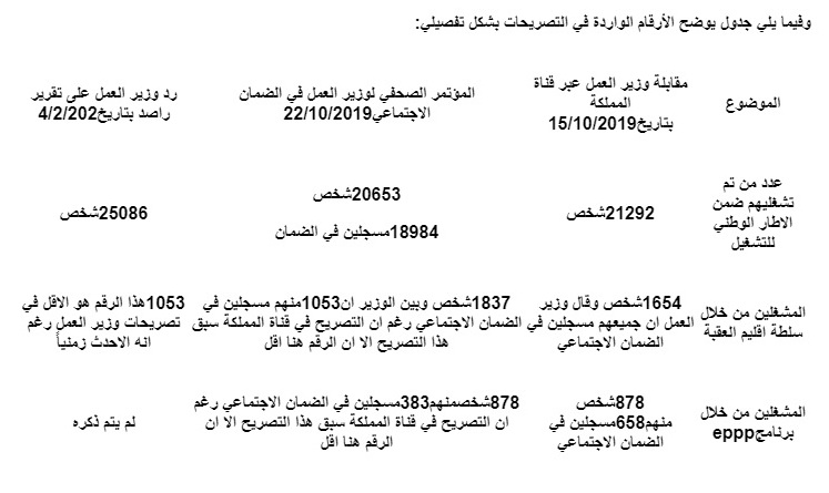 تناقضت تصريحات وزير العمل فيما يخص عدد المشغلين ضمن الإطار الوطني للتشغيل حيث قال خلال مقابلته على قناة المملكة بتاريخ 15/10/2019 أن عددهم بلغ 21292 لينخفض هذا الرقم في تصريحه بتاريخ 22/10/2019 حيث قال أن العدد هو 20653 ليعود ويقول بتاريخ 4/2/2020 ان العدد هو 25086، وهنا يظهر اختلاف في هذا الأرقام التي ذكرها الوزير في 3 تصريحات مختلفة، كما أنه انخفض أعداد المشغلين بعد التصريح الأول ليظهر لنا عدم انسجام في التصريحات.